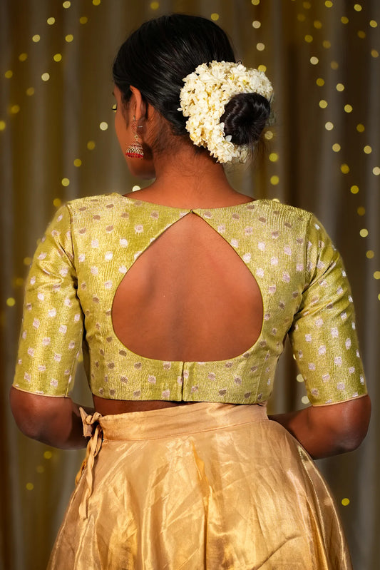 The Banarasi Blouse Collection is an amp-up addition to infuse royalty in your style. Intricated with intertwining floral motifs featuring a gold work and compact weaving, this readymade blouse is a must-have for your traditional events.