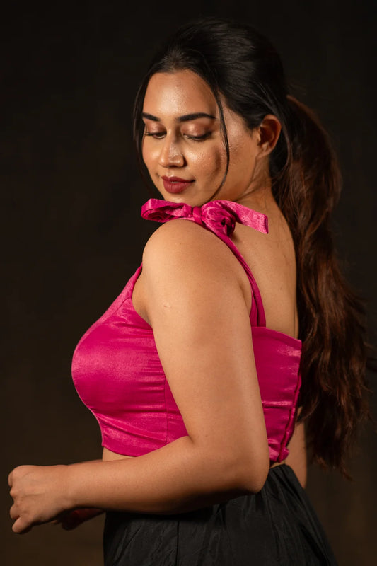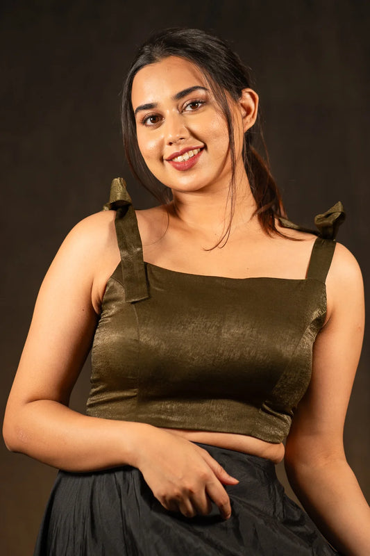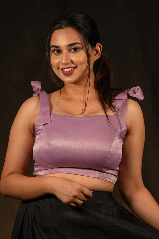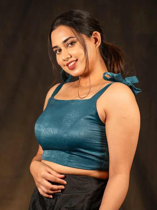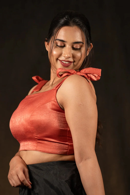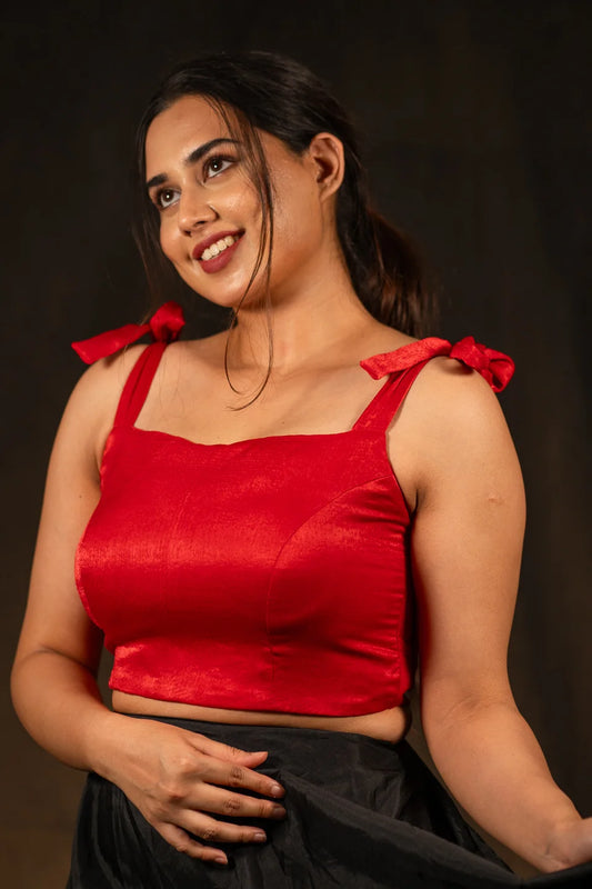 A chic modern spin for your sarees! The exclusive Duha Crop Top Blouses with a knot pattern and square neckline for that sassy saree vibe.