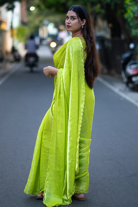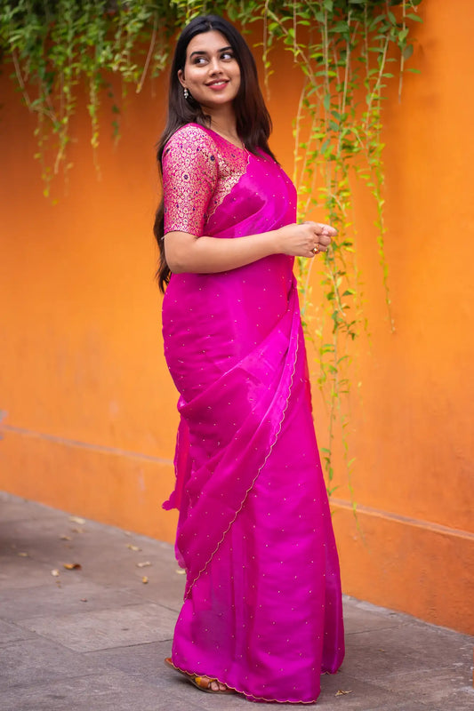 The Serah Organza Saree Collections offer a stunning range of party wear sarees, crafted with embellished beads and hand-embroidered scallop designs at the edges. These sarees are made from high-quality glazy organza fabrics, creating a flawless, regal ensemble for your special celebrations.