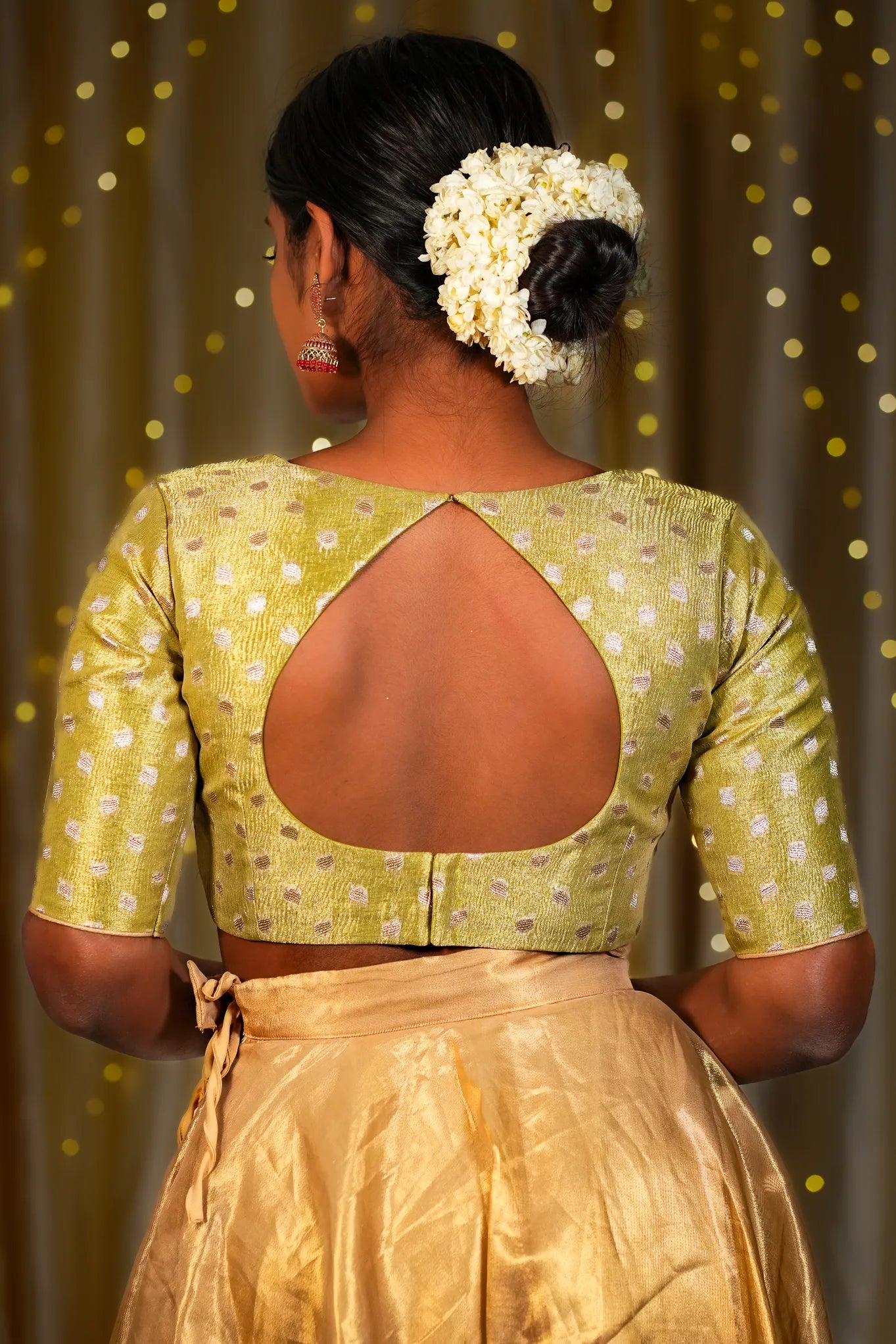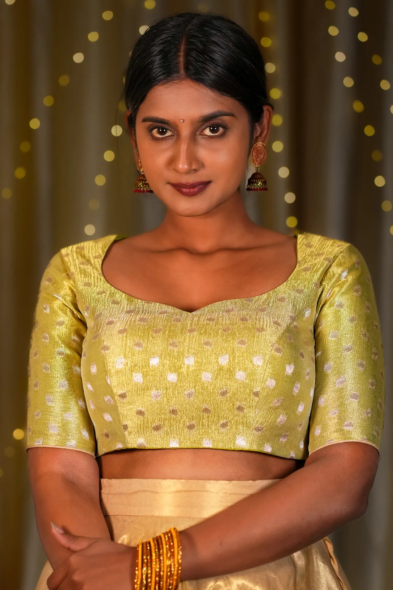 Pair with a contrasting magenta or royal blue saree for a vibrant statement. Accessorize with chunky silver or antique gold jewelry. Go for a bold eye look with nude lips to balance the pop of color. Style your hair in soft curls or a low ponytail for a chic finish.
