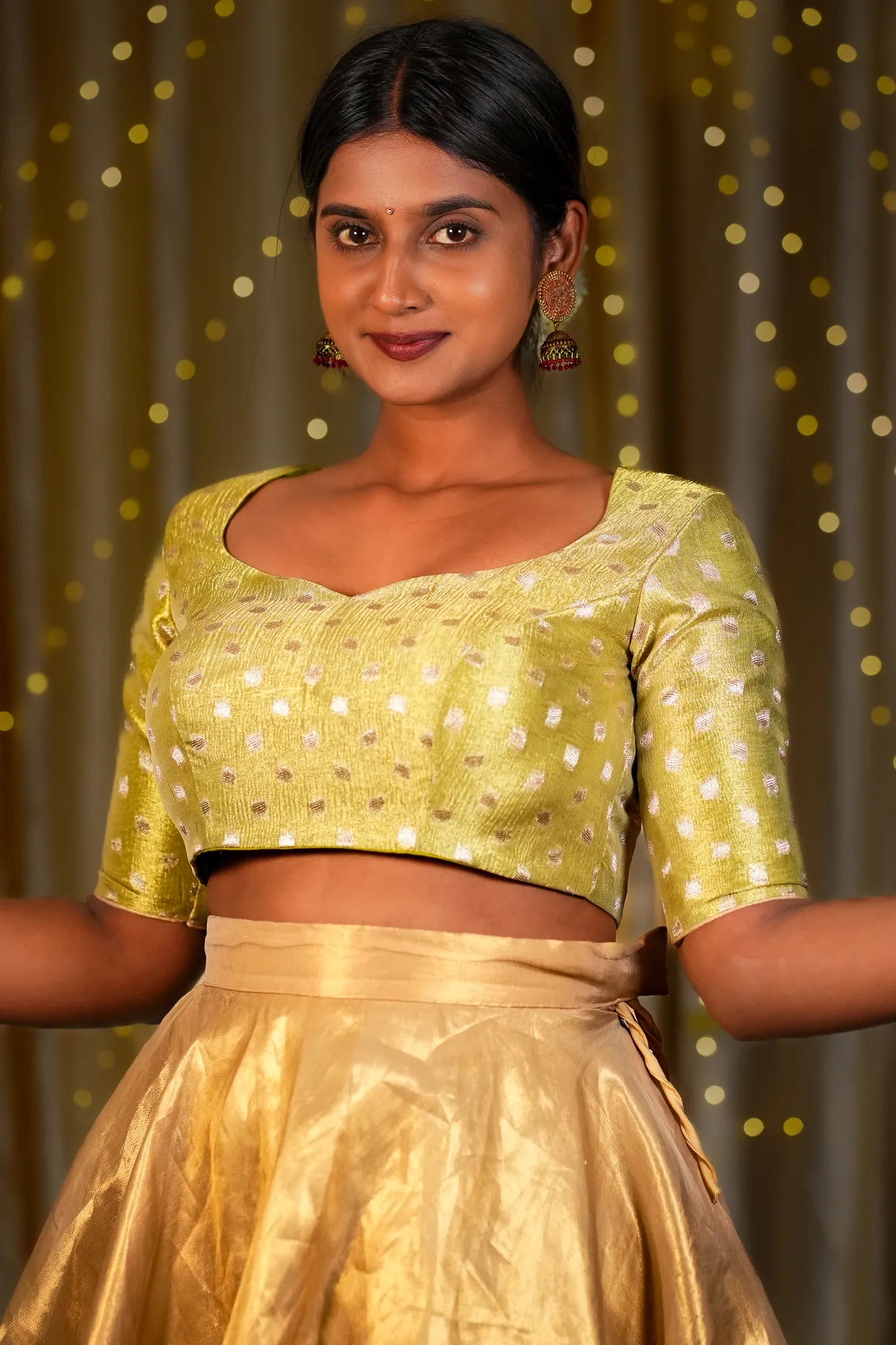 This readymade silk blouse in a striking lime green hue is as stylish as it is comfortable, offering a flawless fit in all the right places. Crafted from premium Tissue Blouse fabric, it features a flattering sweetheart neckline and elegant elbow-length sleeves. Elevate your wardrobe, add it to your cart and shop now!