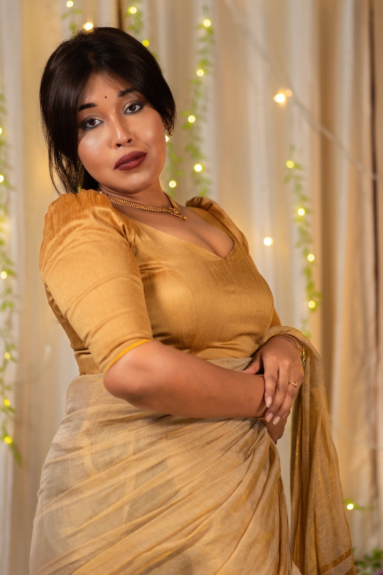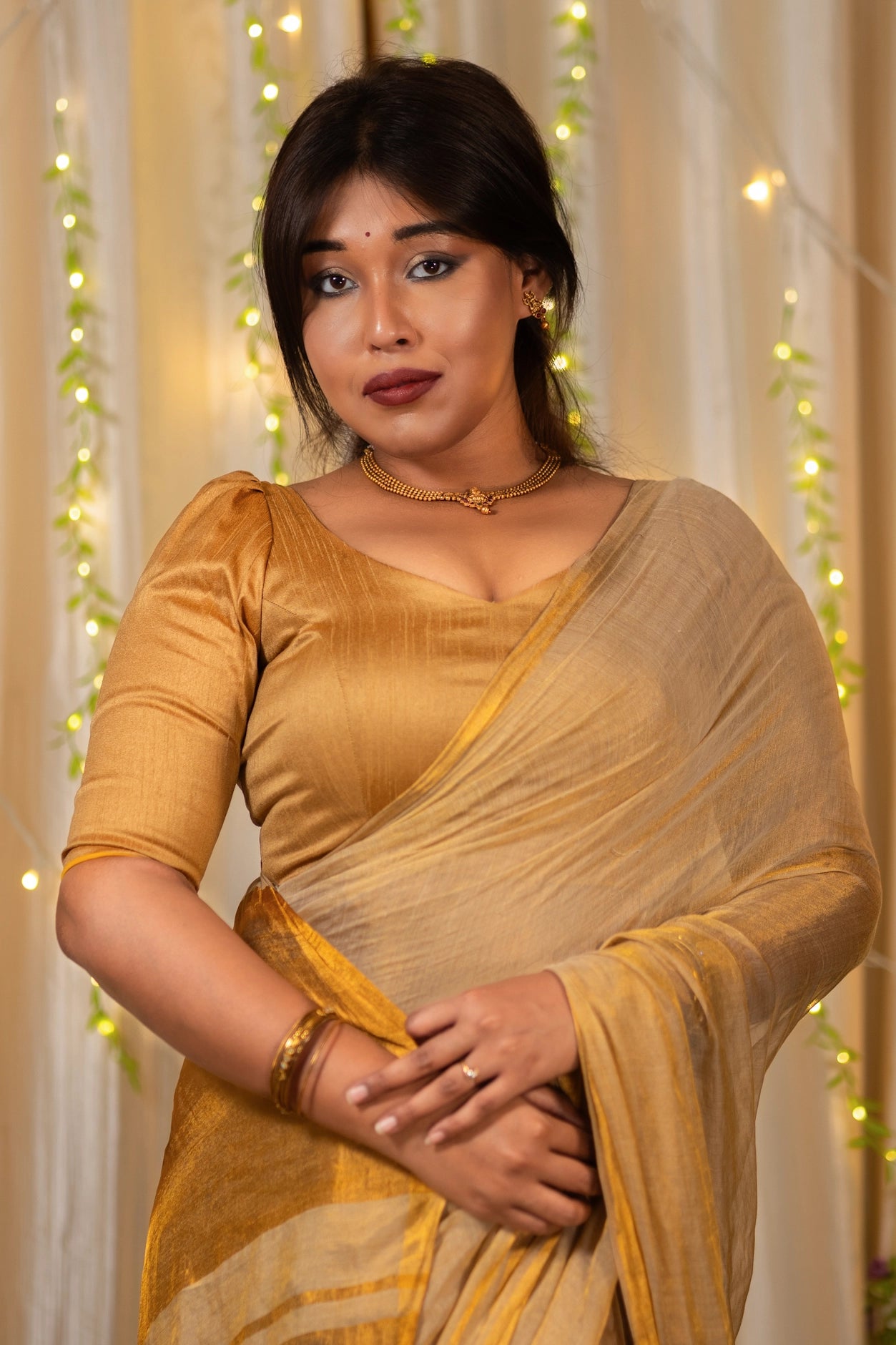 Get ready to slay your special occasion with panache! Rock the Golden Bronze Puff Sleeve Blouse with a touch of golden Tissue silk saree. Glam it up with a dazzling Kundan neckpiece and earrings. Add some soft curls to your hair for that extra oomph! Keep your makeup subtle to let your natural beauty shine, paired with a nude glossy lip for that extra pout. Finish off your look with stylish flats and a pearl oyster clutch to seal the deal in style!