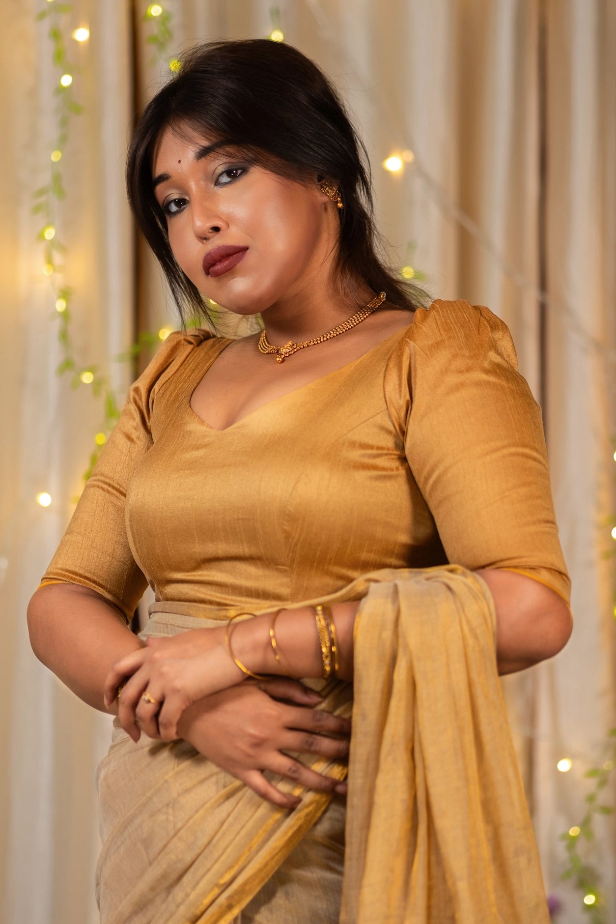 Introducing our Bronze Traditional Puff Sleeve Readymade Blouse! Elevate your style game with this elegant piece featuring puff sleeves and a chic V-neckline, radiating femininity and grace. Be a trendsetter and unleash your inner fashionista with this eye-catching blouse that guarantees all eyes on you!
