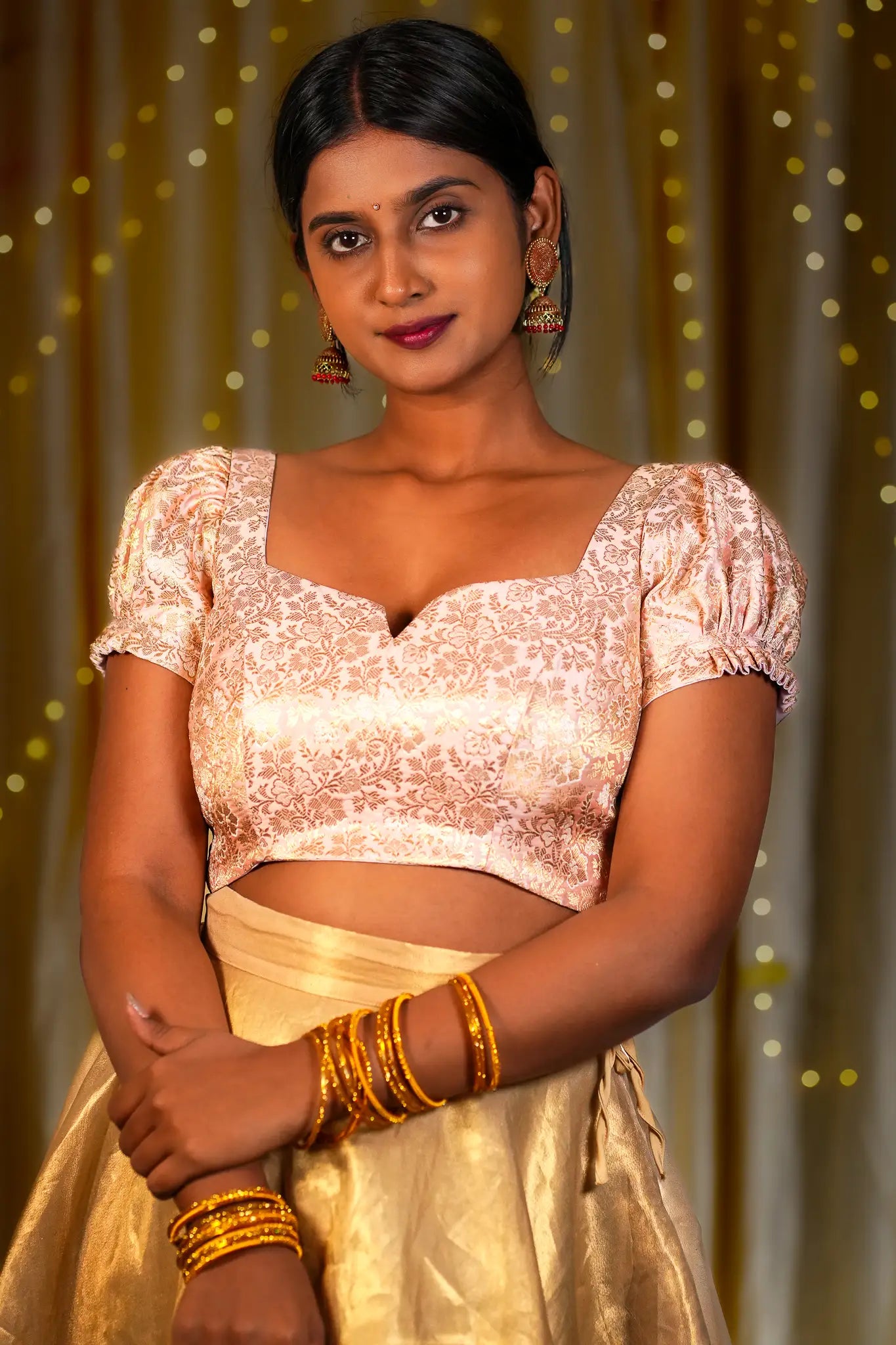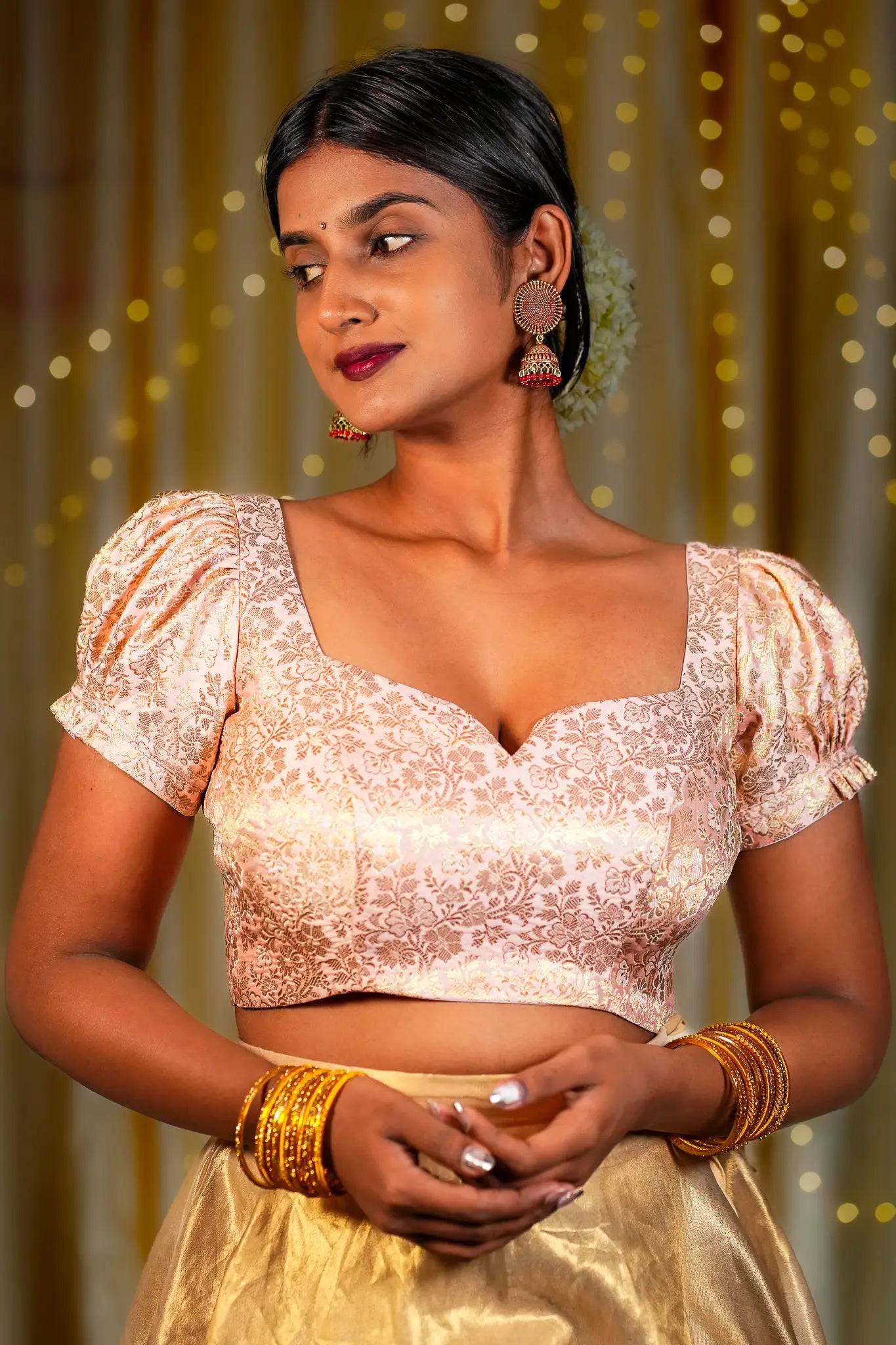 Pair this light pink Banarasi blouse with a contrasting mint green, ivory, or rose gold saree for a soft, romantic look. The square neckline beautifully complements delicate pearl or rose-gold jewelry. Style your hair in a low bun or soft waves to highlight the puff sleeves. Finish with rosy makeup and embellished sandals for an effortlessly graceful ensemble.