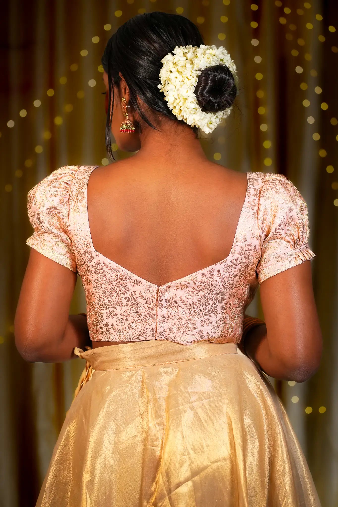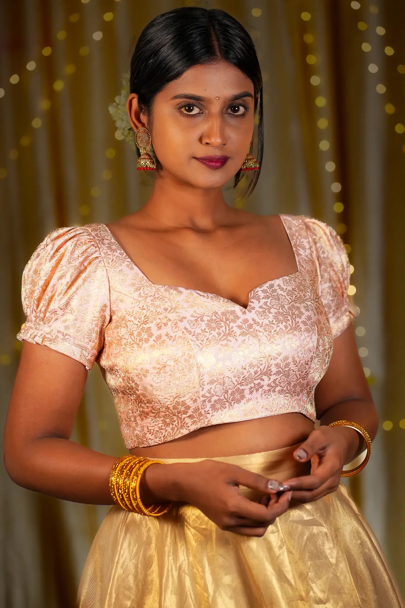 Elevate your saree style with this exquisite light pink Banarasi readymade blouse, tailored to perfection for a flawless fit. Featuring elegant gathered puff sleeves and a sophisticated square neckline with a subtle V-neck detail, this blouse effortlessly blends traditional charm with modern flair. Make it yours today and add a touch of timeless elegance to your wardrobe!