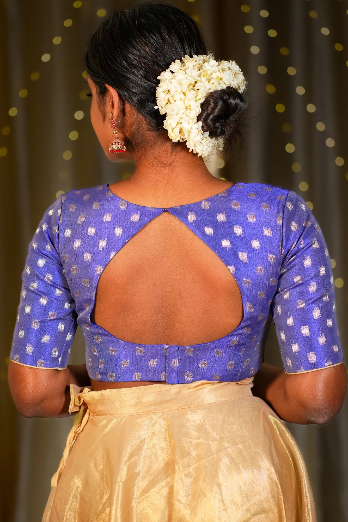 Discover our stunning blue tissue silk readymade blouse, crafted from premium crushed tissue fabric. Featuring a chic halter-inspired sweetheart neckline and an elegant open-back design, this blouse is the perfect complement to your saree. Completed with elbow-length sleeves, it effortlessly blends sophistication and style. Don’t miss out, add it to your cart today!