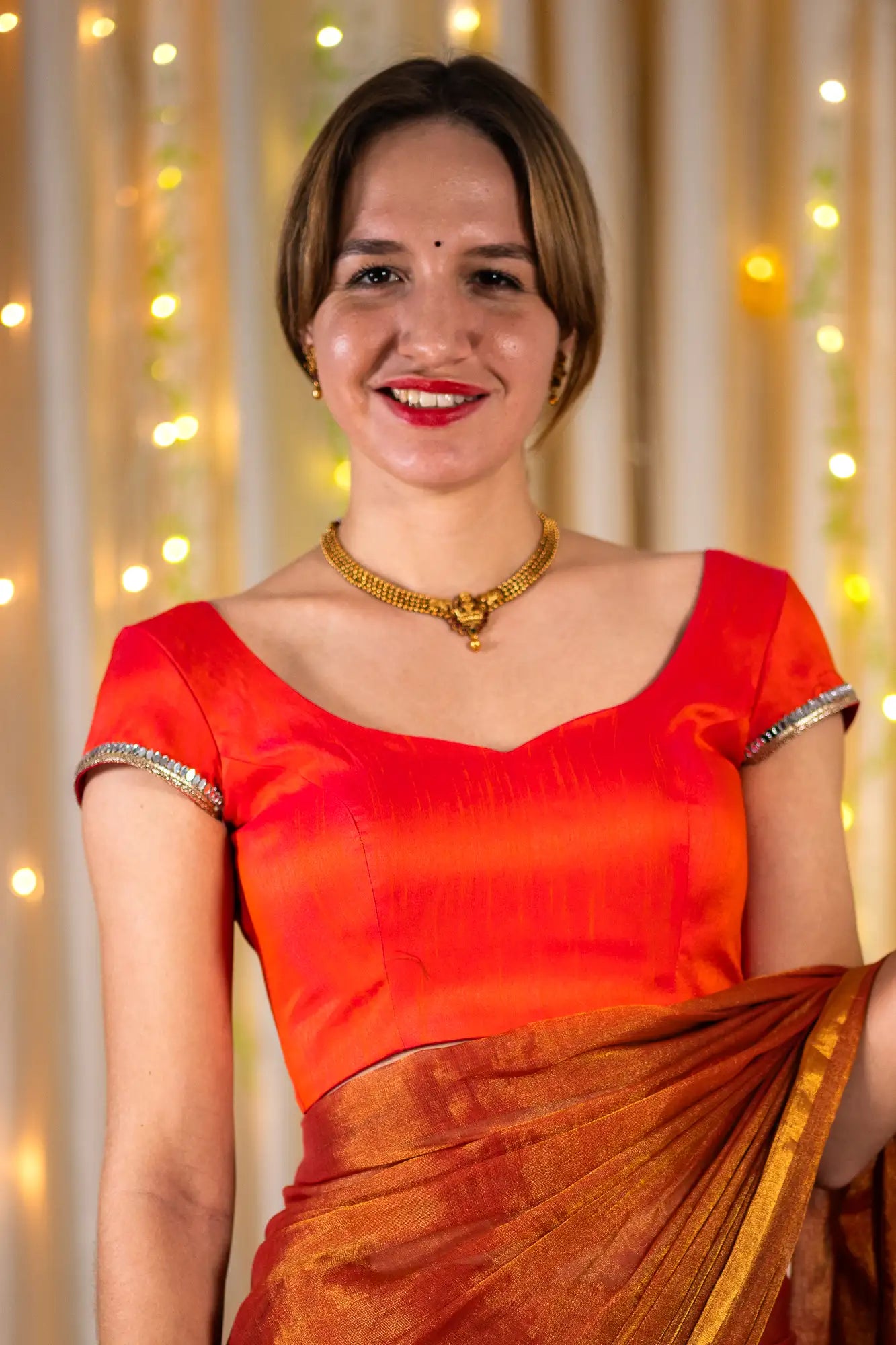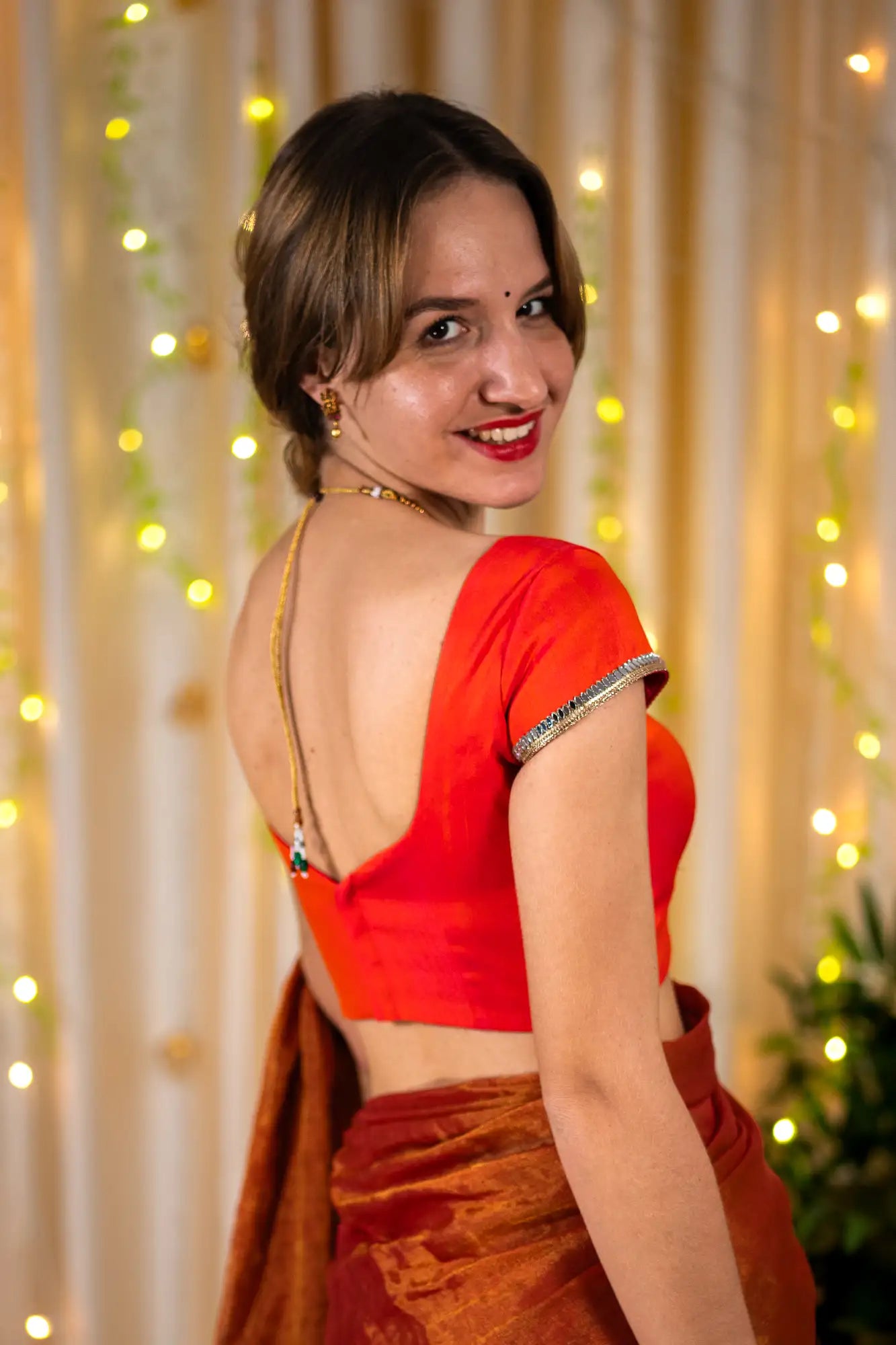 Let's create a stunning look with this captivating coral red cap sleeve readymade blouse. Pair it up with a mesmerizing Tissue silk saree for an irresistible combination. Now, let's dive into the enchanting world of makeup. Opt for a breathtaking no-make-up makeup look, accentuated by a vibrant red lipstick that perfectly complements your skin tone. For your hair, go for a sleek bun adorned with stylish fringes. Complete your glamorous ensemble with a dazzling gold neck chain, elegant earrings, and a chic bracelet. Slip into your fashionable block heels and grab a statement purse to make heads turn wherever you go. Get ready to steal the spotlight!