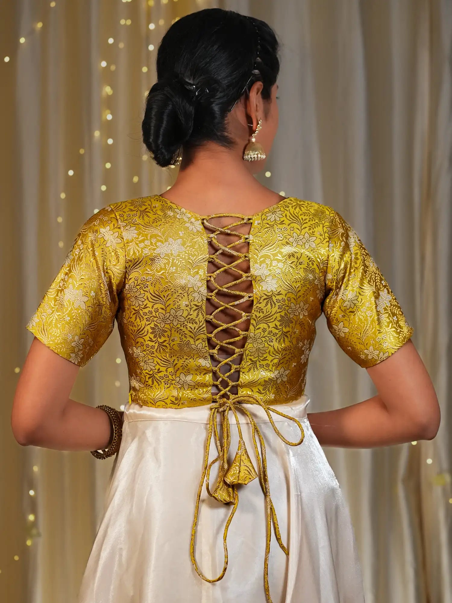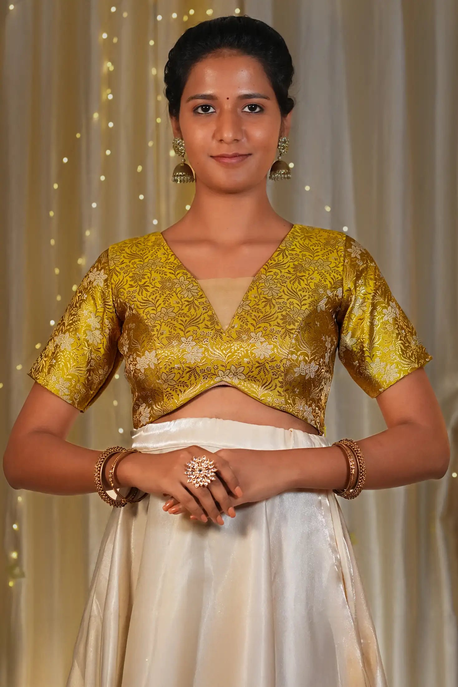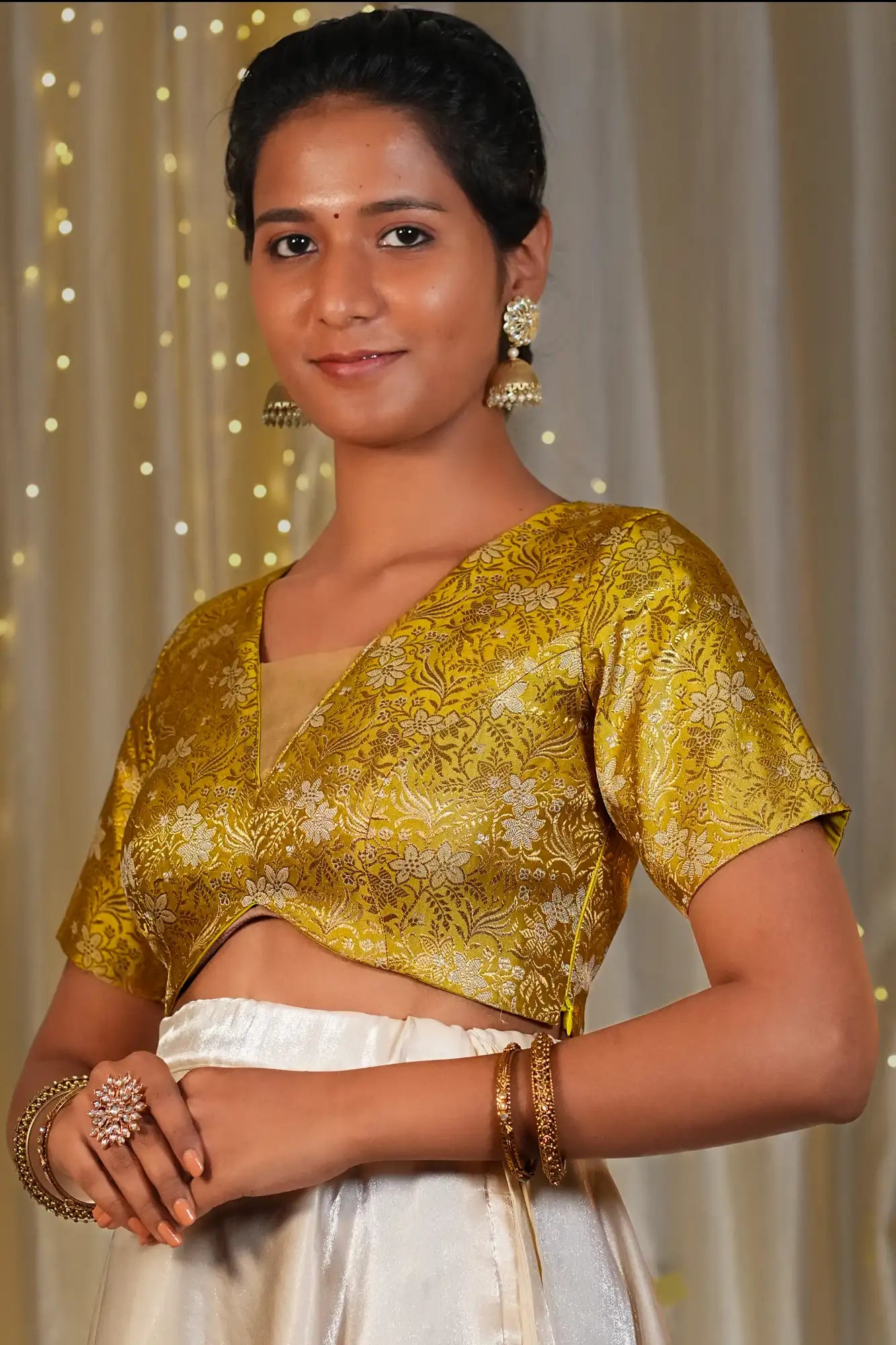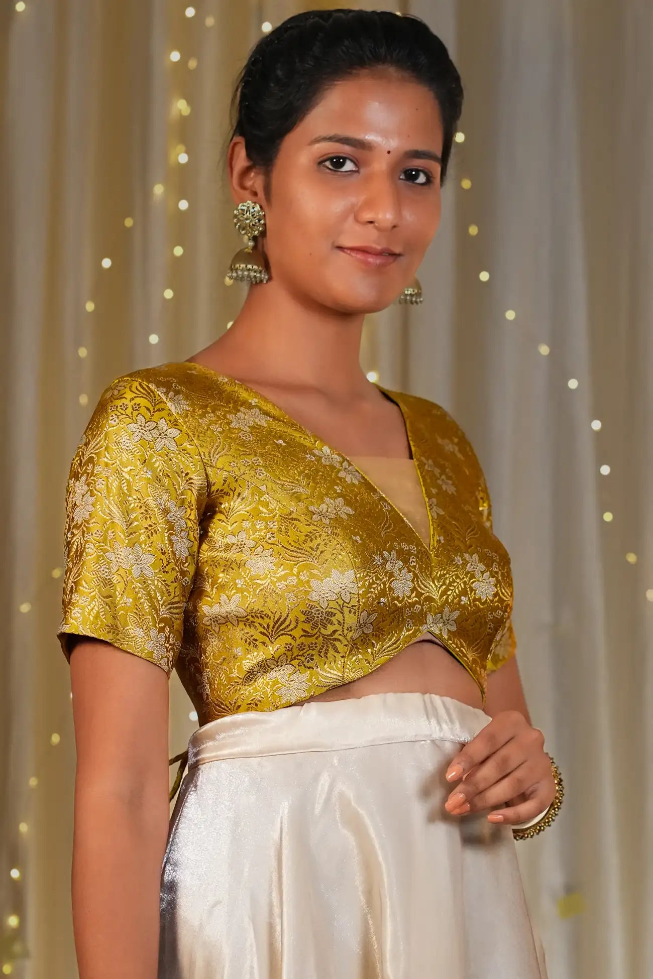 Brighten up your ethnic wardrobe with this yellow tie-up knot back blouse crafted in premium Banarasi fabric. Featuring a bold deep V neck cut and rope-style knot, it’s great for haldi or daytime festivities. Includes a side zipper to keep your look sleek and fuss-free.