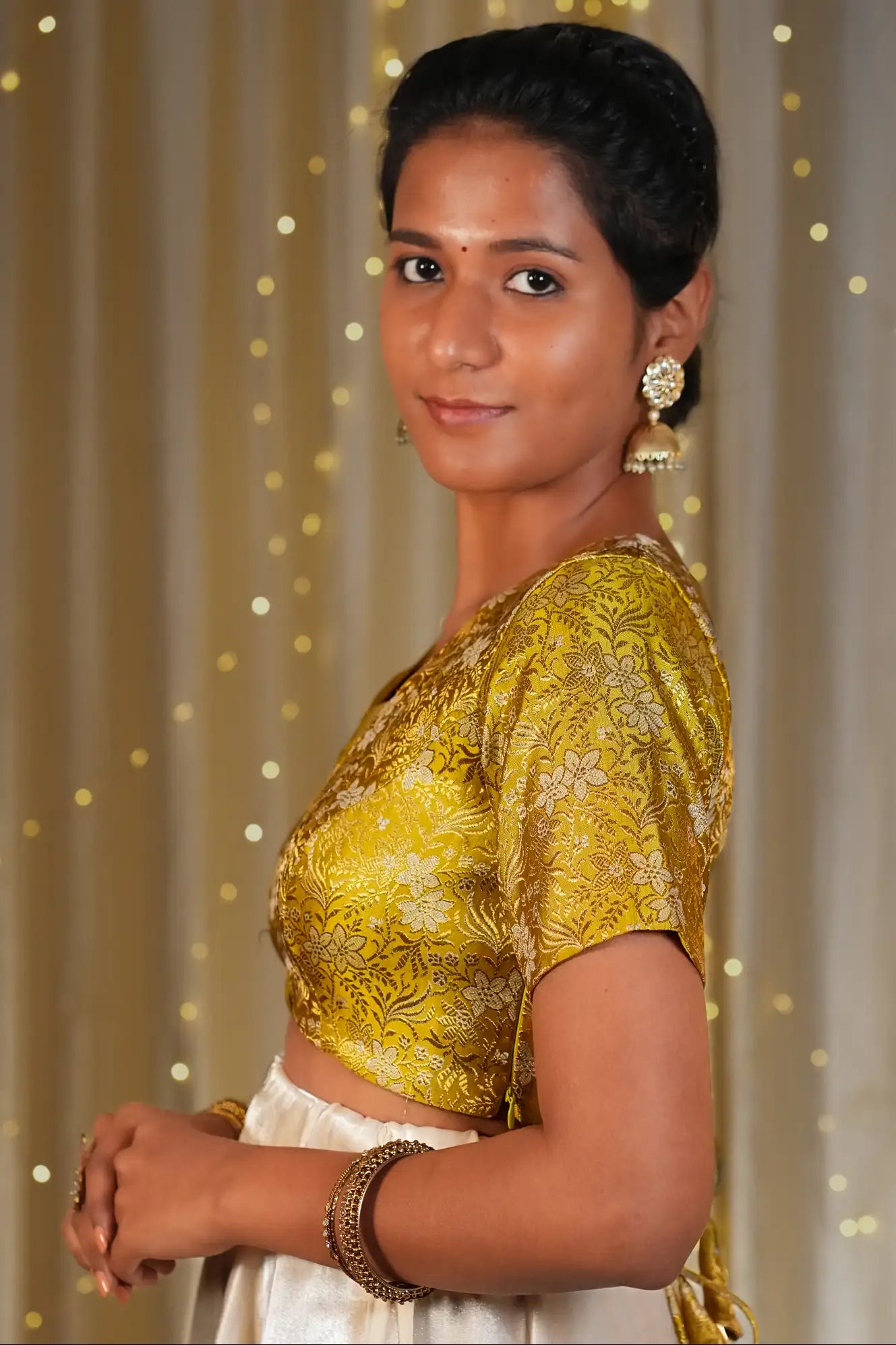 Pair this yellow tie-up knot back blouse with a floral or contrasting green saree for a joyful haldi or day event look. Add gajra-adorned braids and minimal gold jewelry for a fresh, radiant vibe. Let the knot back design shine with a soft drape.