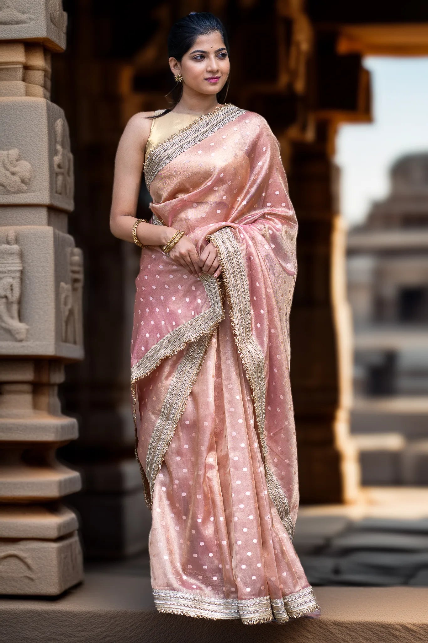 Step into elegance with this dusty pink Banarasi tissue silk saree, handwoven with pure tissue zari for a soft, sheer glow. The golden lace border and delicate polka dot motifs add a regal touch to your party wear look. Graceful and timeless, it drapes beautifully for any special occasion. Add this elegant piece to your cart and shop now!