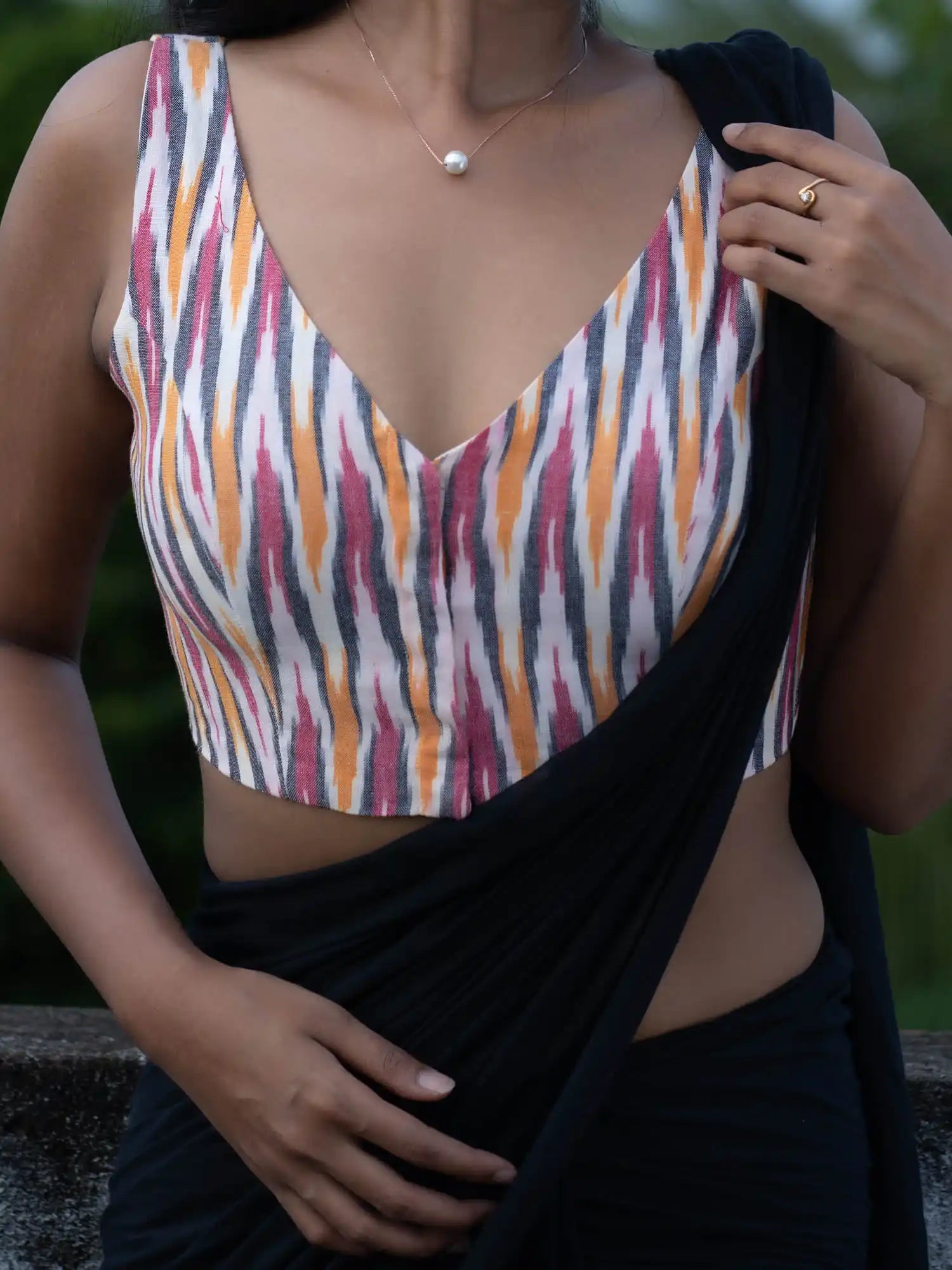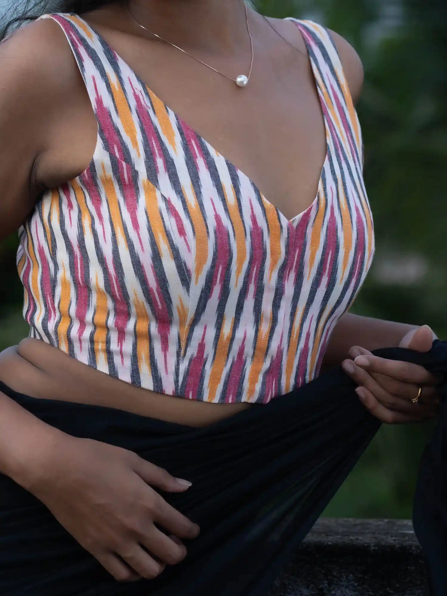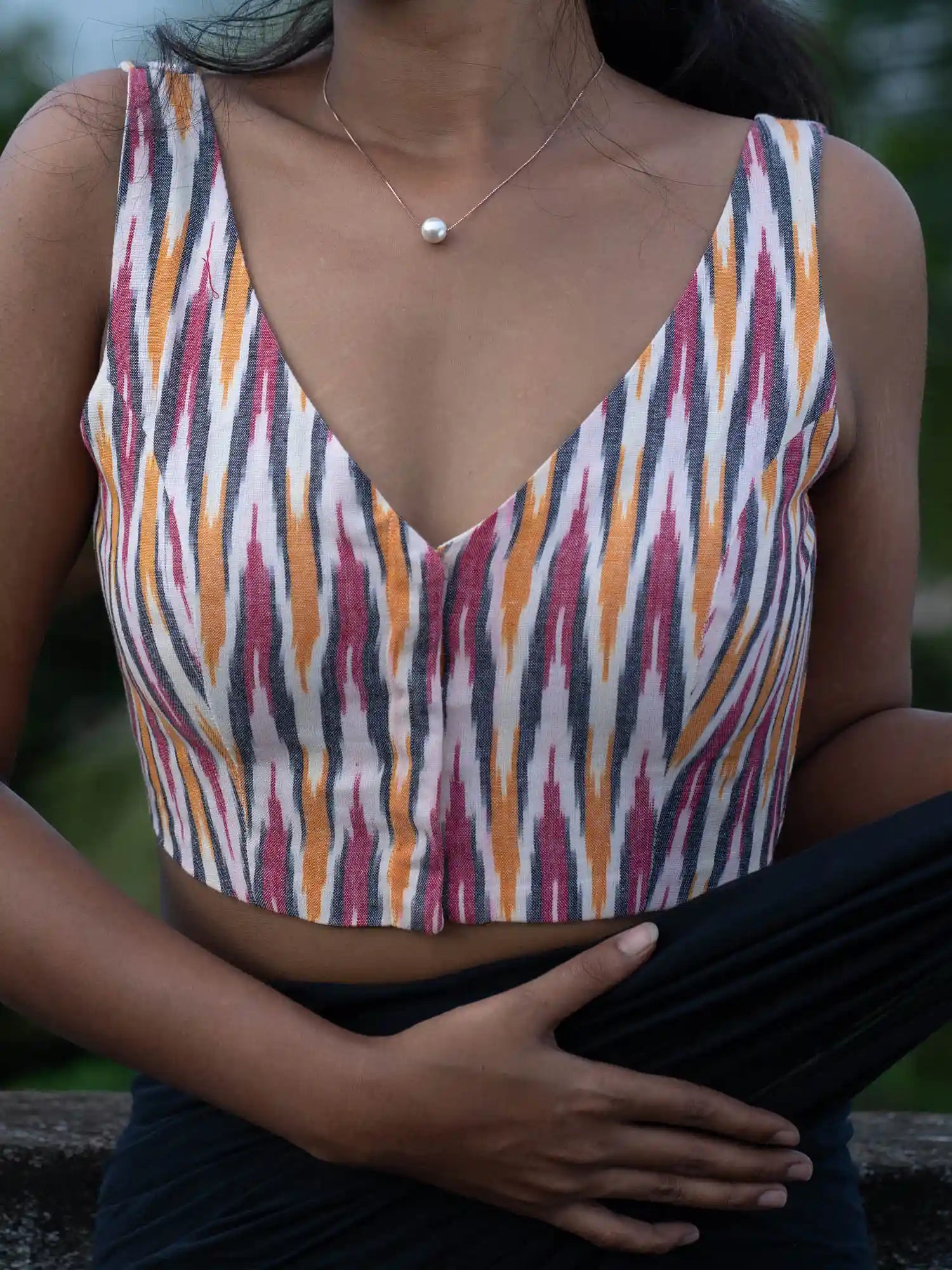 We created this Ikkat Sleeveless Saree blouse from the stunning amalgamation of purple, pink and yellow on white! A masterpiece that keeps everyone spellbound, this blouse is the perfect pick when you want to add a splash of colours to your look. Its ever-so-soft material and the trendy v-neck will inspire you to get through the day with a smile!