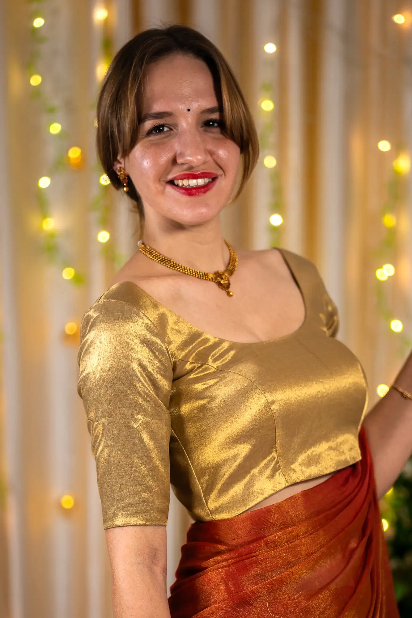 Prepare to captivate hearts with its resplendent antique golden hue, radiating an air of unparalleled elegance and sophistication. The inclusion of full sleeves adds a touch of graceful allure, granting you the sensation of being a true queen. The use of high-quality tissue fabric ensures utmost comfort while enhancing your overall appearance.