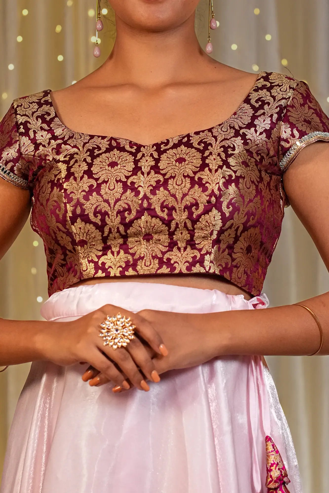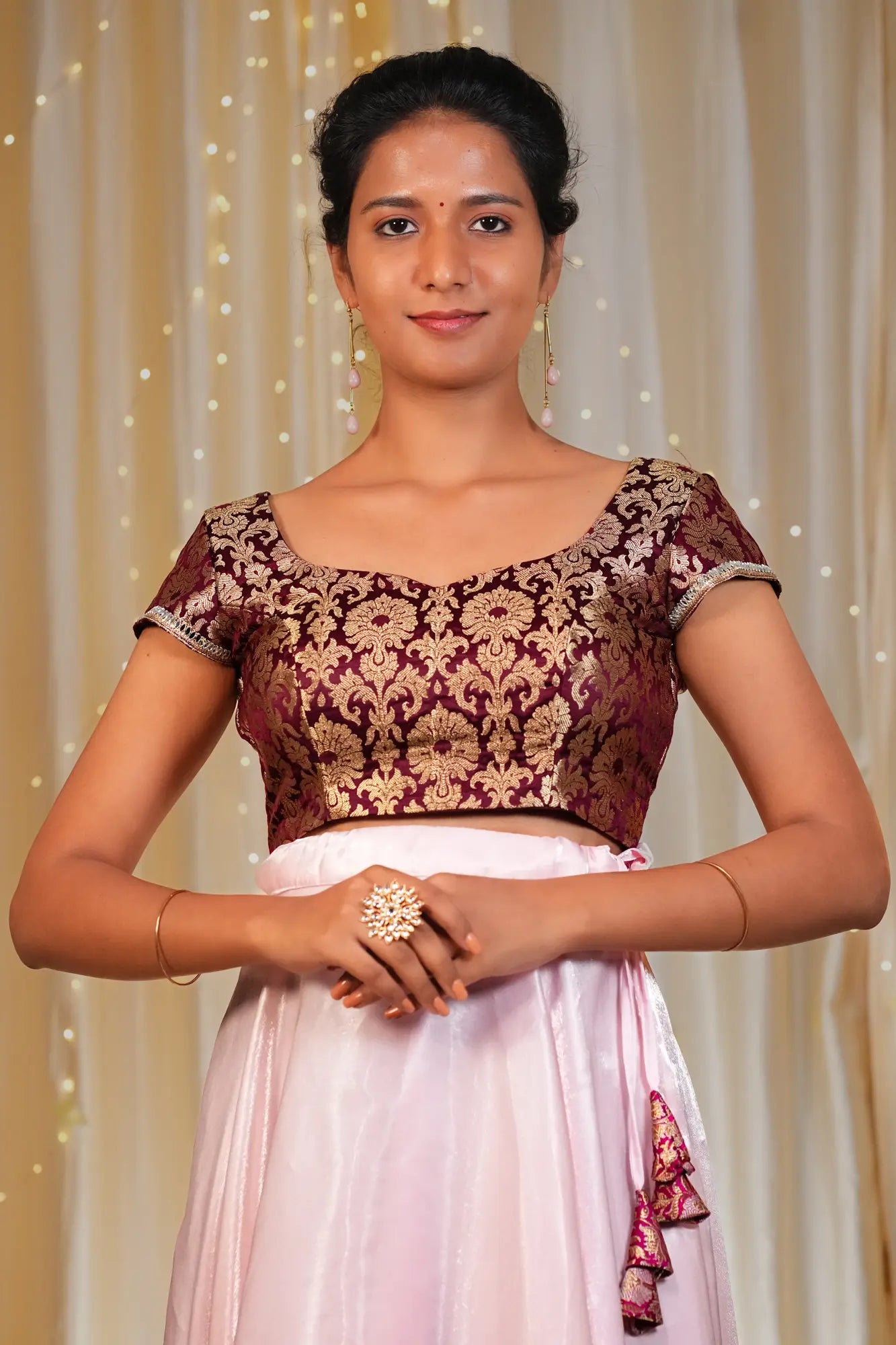 Pair this dark maroon Banarasi blouse with a gold, beige, or deep green saree for a regal look. Accentuate the mirror lace detailing with statement gold jewelry or antique kundan pieces. Opt for a sleek bun or soft curls, adding a bold red lip for a glamorous touch. Complete the ensemble with embroidered juttis or classic heels for effortless elegance!