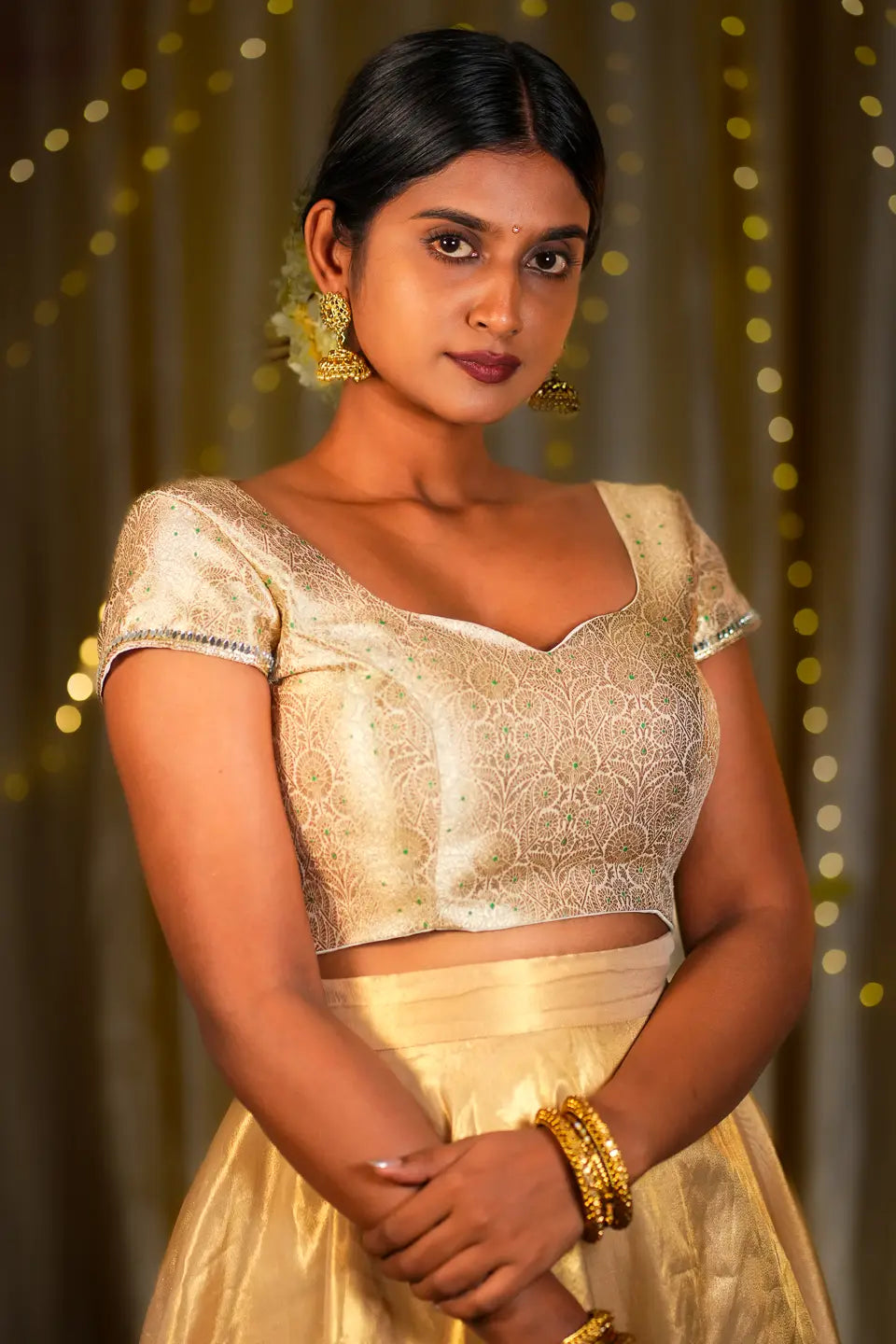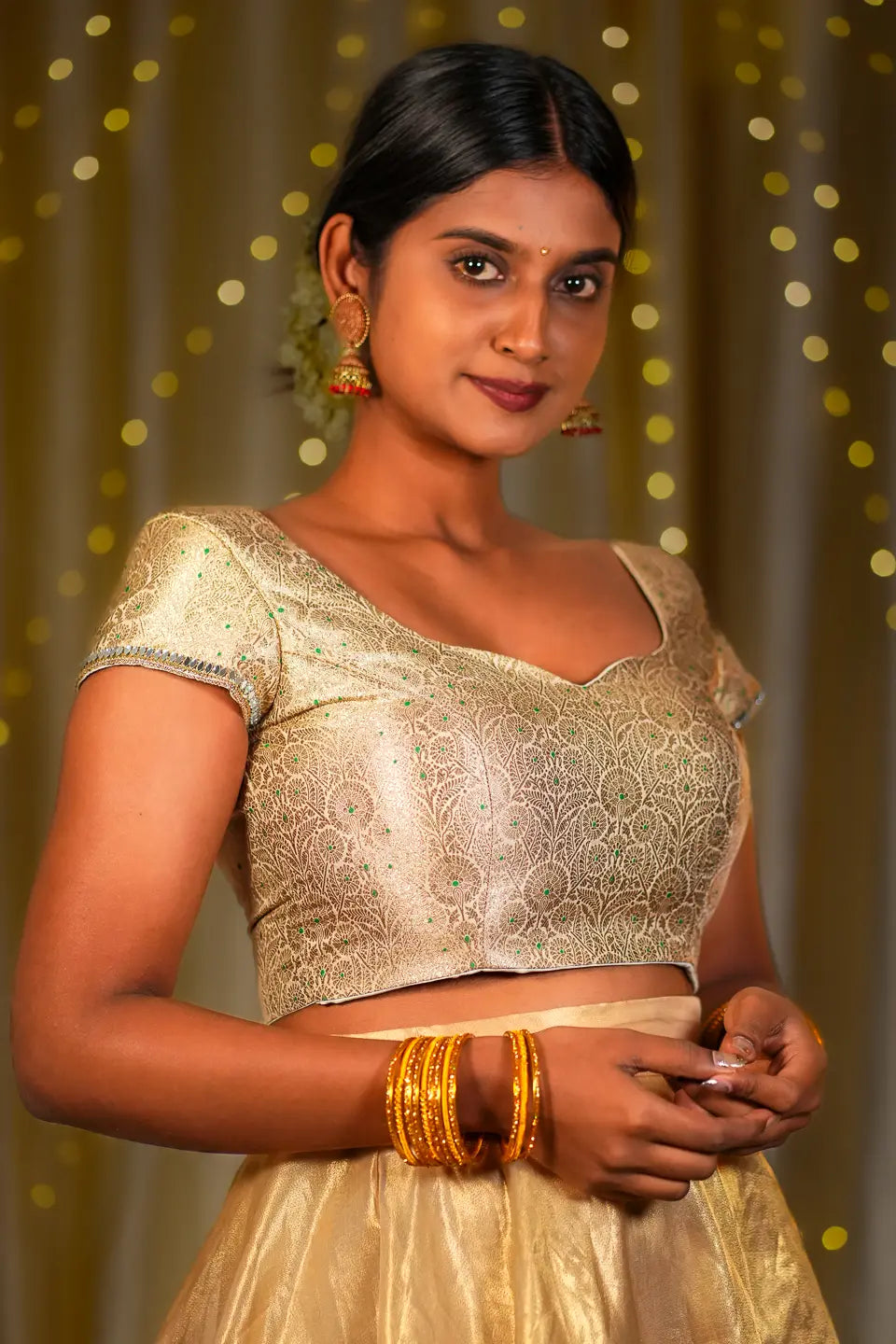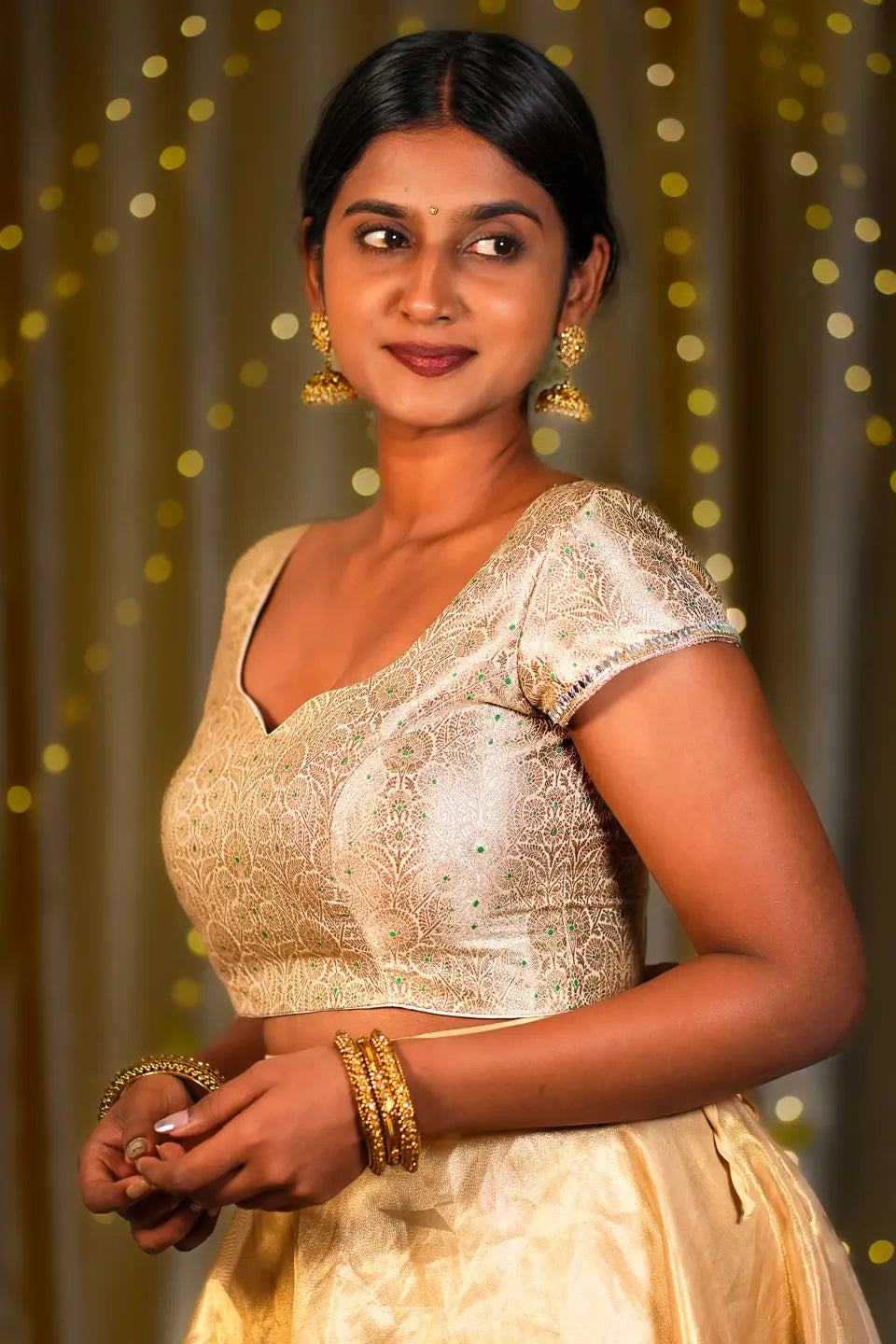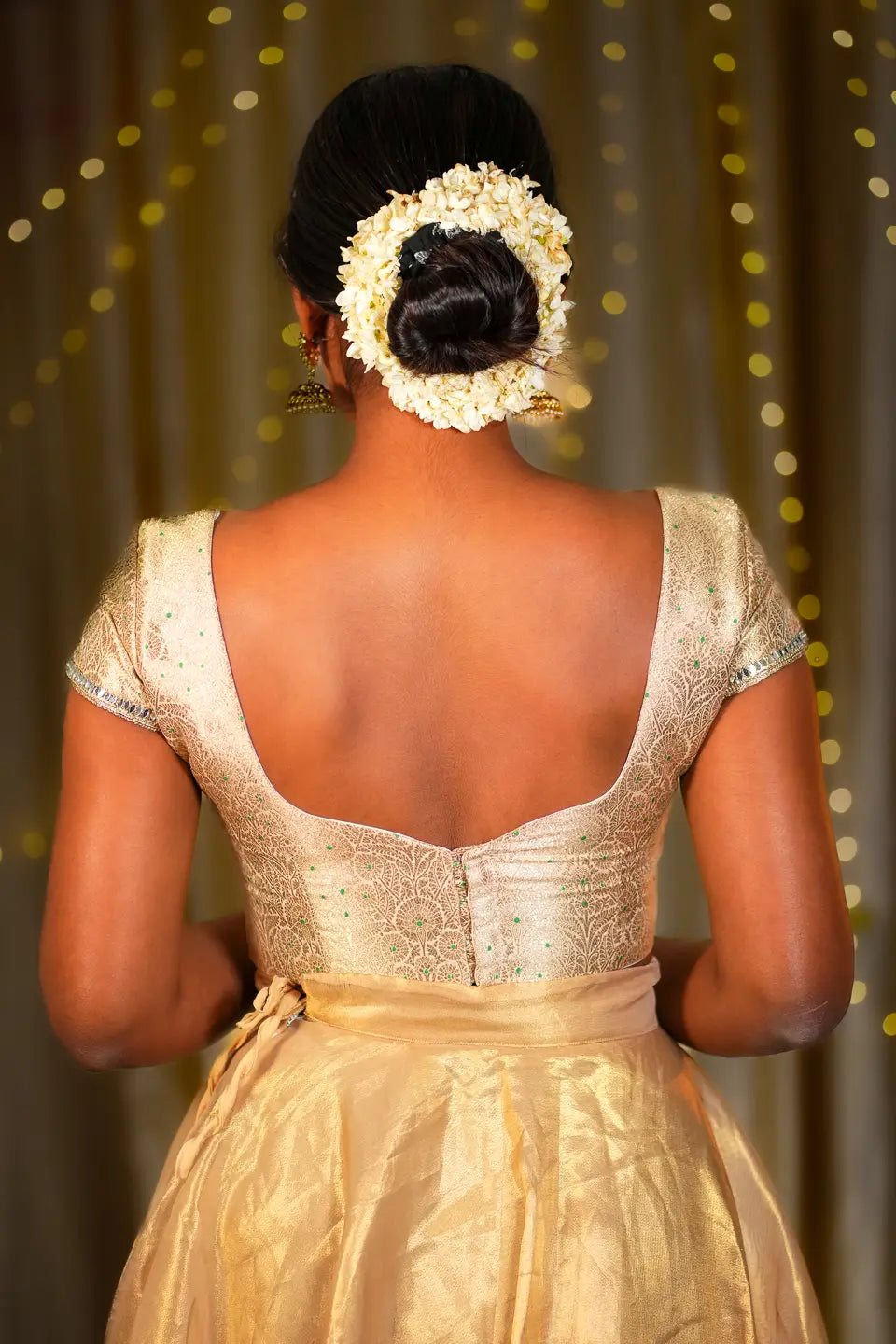 Pair this beige Banarasi blouse with a rich silk or chiffon saree in gold, maroon, or deep green for a regal look. Accessorize with traditional temple jewelry or statement gold pieces to enhance its elegance. Opt for a sleek bun with fresh jasmine flowers or soft waves for a graceful touch. Complete your look with dewy makeup and a bold bindi for a classic finish!
