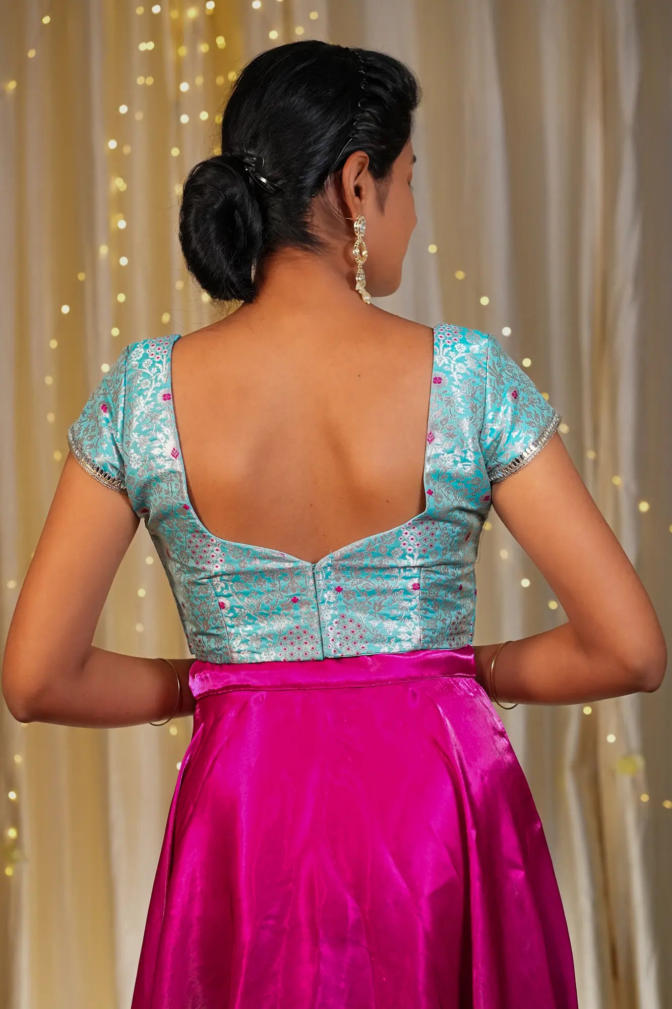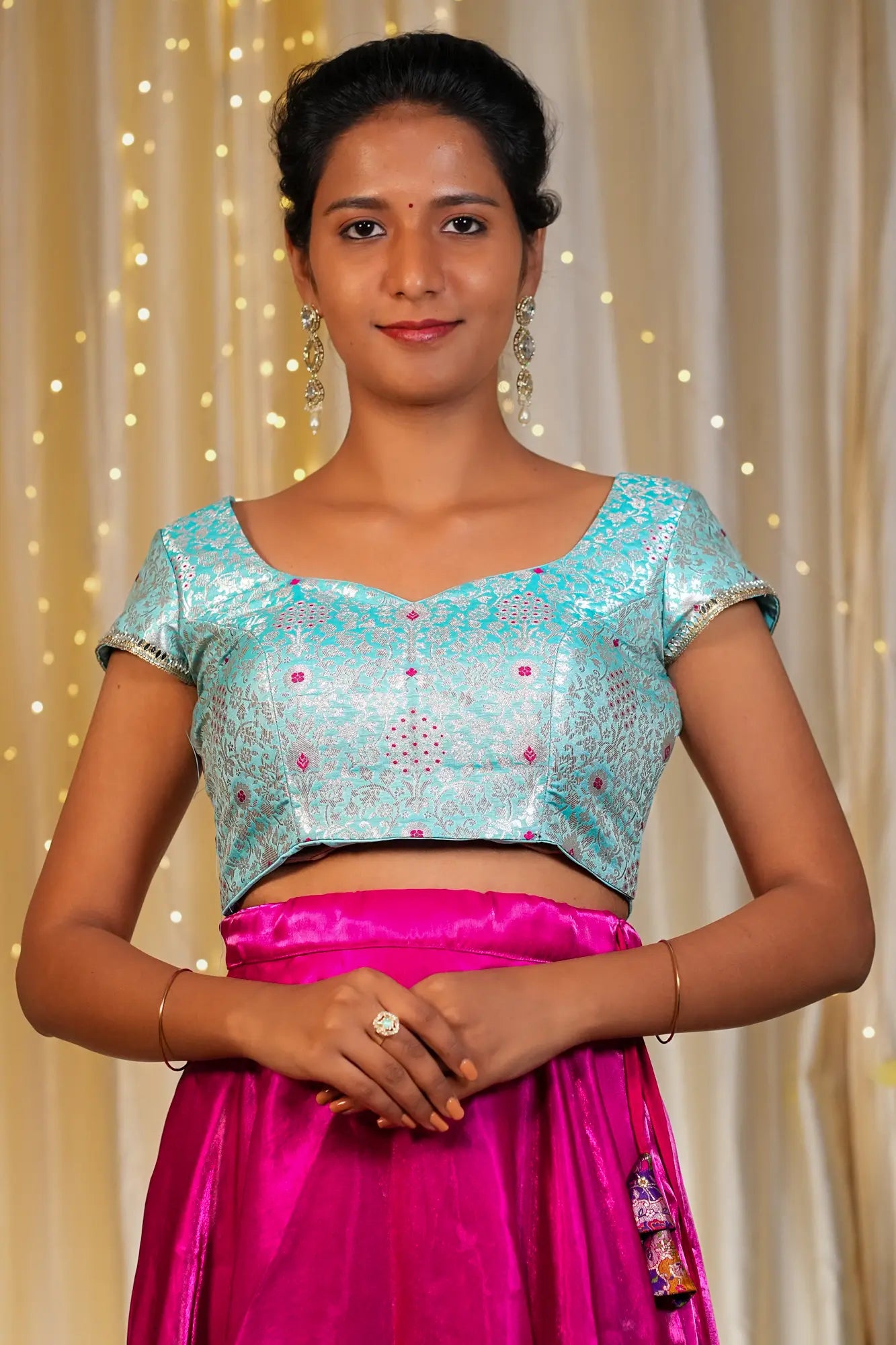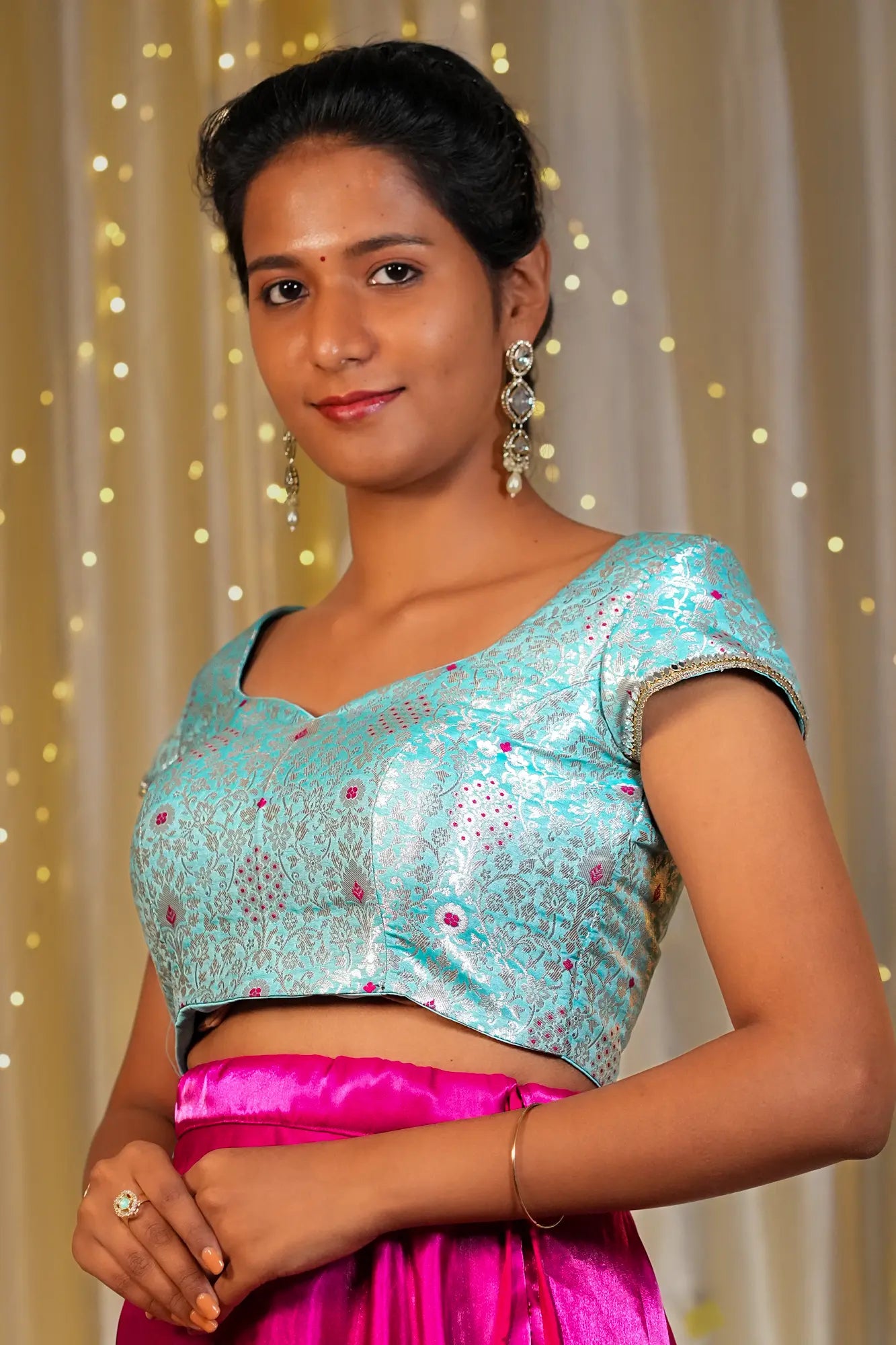 Pair this elegant sky blue Banarasi blouse with a silver or pastel saree for a graceful, ethereal look. Add statement silver jewelry or pearl accessories to enhance its charm. Opt for a sleek bun or soft curls to complement the blouse’s elegance. Complete your look with subtle makeup and a shimmering clutch for the perfect finishing touch!