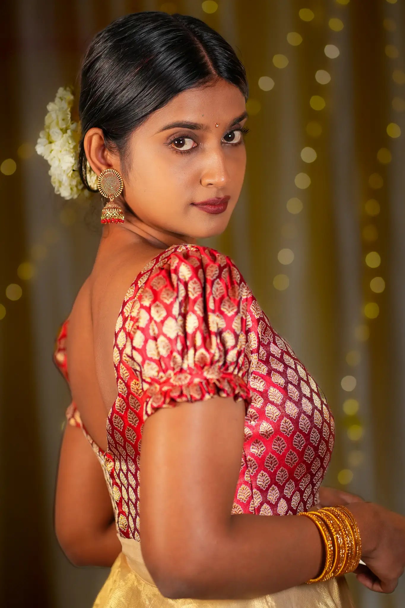 Style this deep maroon Banarasi blouse with a gold, cream, or mustard silk saree for a rich festive look. The elegant neckline pairs well with traditional chokers or layered temple jewelry. A sleek low bun or vintage waves will highlight the puff sleeves beautifully. Complete your ensemble with bold eyeliner, a bindi, and embellished heels for a timeless celebration-ready outfit.