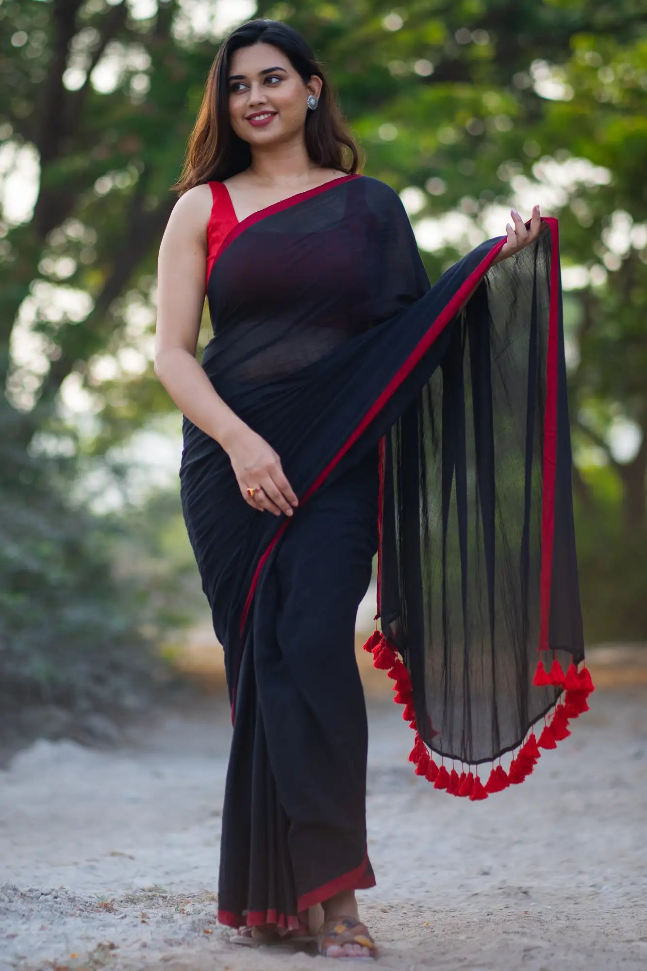 Did you again purchase a black saree piece? This time with red borders. Choose a sleeveless deep neck blouse to accentuate this beauty. Wear a bold colour lipstick such as crimson. Accessories it with your oxidised choker and statement dangles. Were a ring too. Complete the look with smoky-eyed makeup. Wear your open toe strap heels. All hail to the queen!