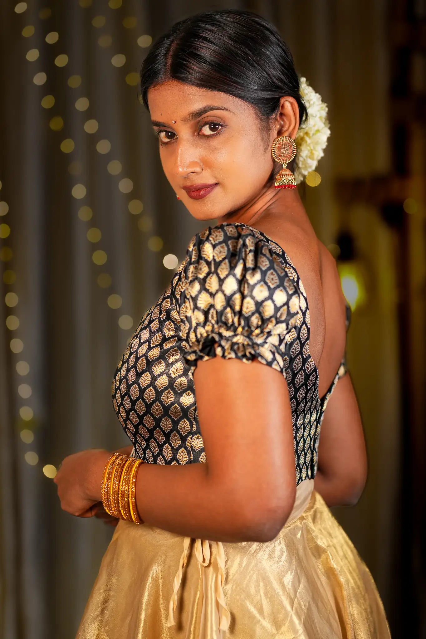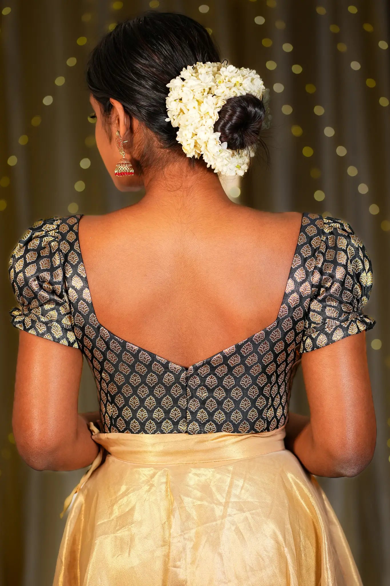 Style this chic black puff-sleeve blouse with a bold printed or metallic saree for a striking contemporary look. The square neckline makes it ideal for pairing with sleek chokers or layered chains. A high ponytail or messy bun will showcase the puff sleeves beautifully. Complete the ensemble with smoky eyes, statement studs, and heels for an effortlessly modern vibe.