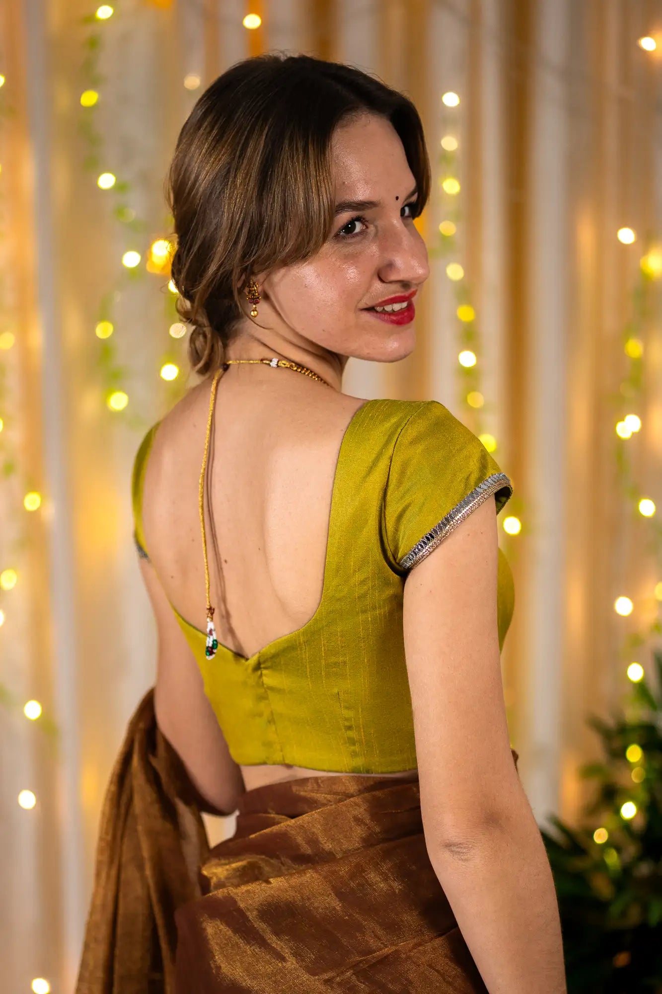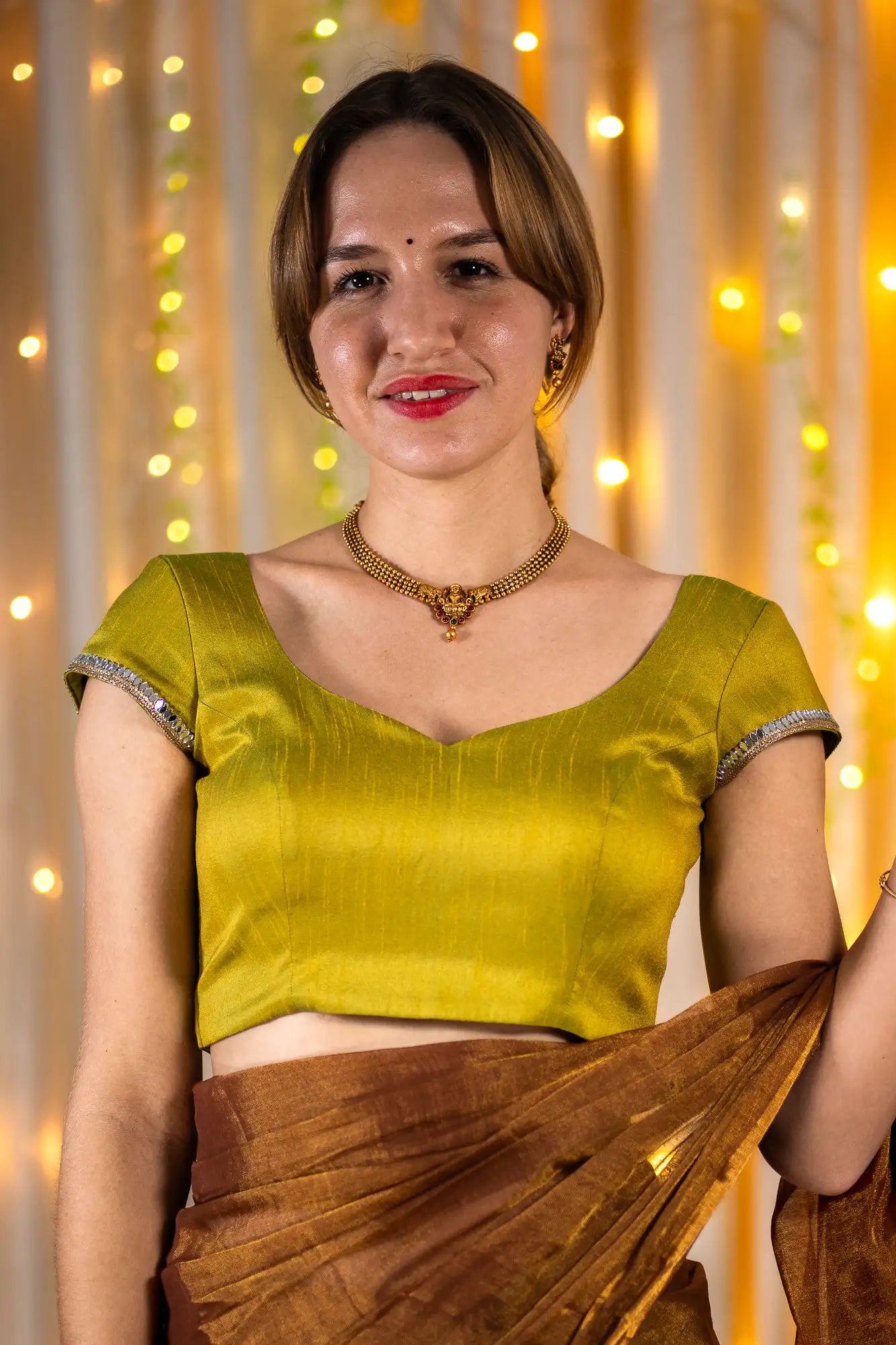 Leave your in-laws in awe with your ethereal presence. Pair this exquisite Olive Green Cap Sleeve Blouse with a contrasting organza saree for a truly captivating ensemble. Enhance your look with a stunning sleek necklace and earrings. Opt for a polished makeup look that radiates elegance. Complete your attire with open-toe heels and an elegant clutch purse. Exude timeless sophistication and prepare to captivate everyone as you make your grand entrance.