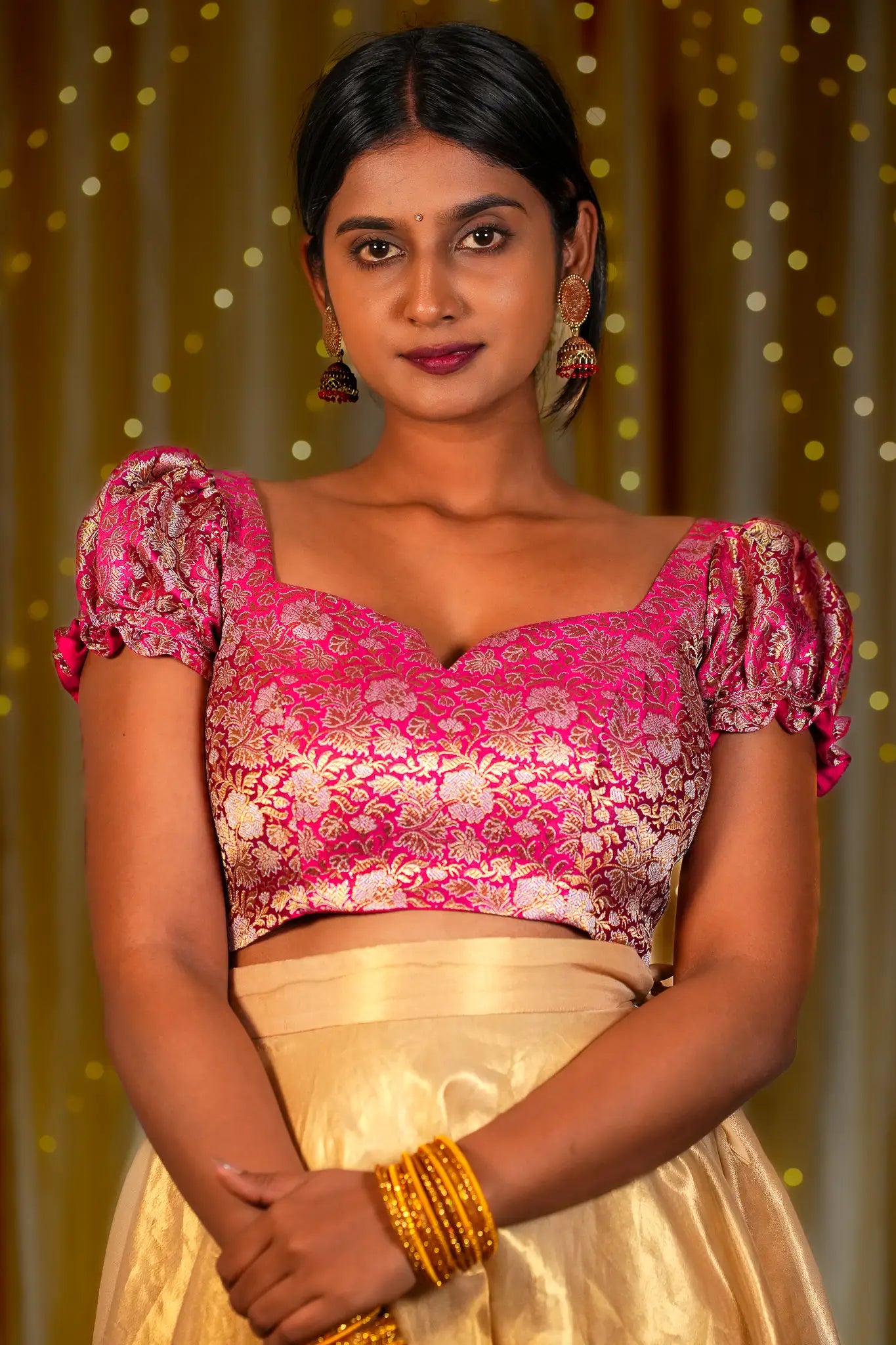 Upgrade your wardrobe with this maroon puff-sleeve Banarasi blouse, crafted from premium fabric for a perfect fit. Featuring gathered puff sleeves, a square neckline with a V-cut, and a back hook closure, it blends traditional charm with a modern touch. Add this timeless piece to your collection before it’s gone!