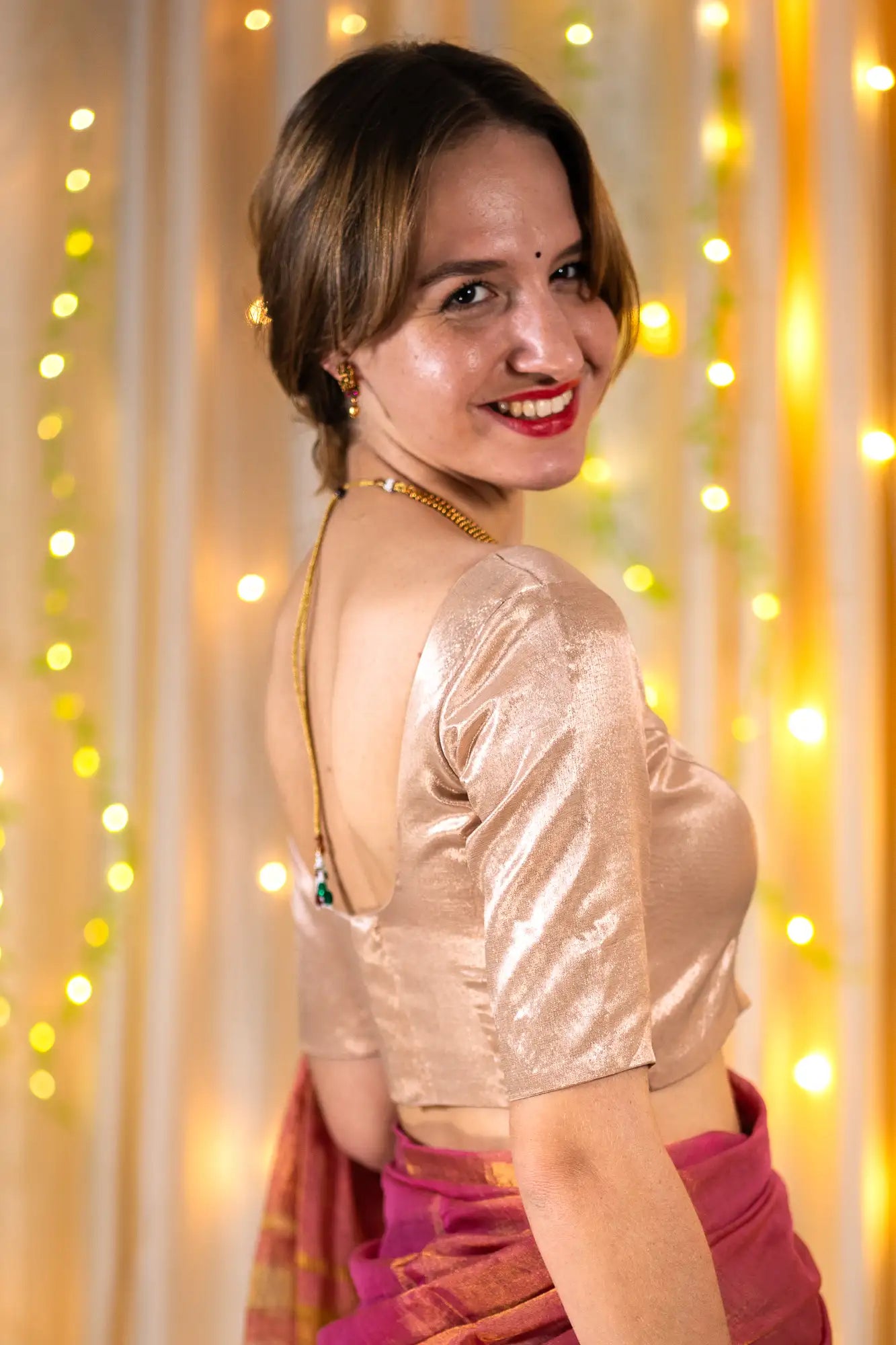 Bringing an exquisite cocktail-party ensemble for you! Get ready to shine in this stunning rose-gold silk blouse, paired elegantly with a matching lehenga skirt and dupatta draped in your preferred style. Complete your look with a captivating green diamond necklace and earring set, adding a delightful contrast to your ensemble. Adorn your wrists with beautiful bangles to enhance your beauty. For makeup, opt for shimmering eyes, accentuated cheeks, and a flattering pink shade that complements your skin tone. Style your hair with a side partition, curl a few strands, and tie them in a chic low bun with minimalist hair accessories. Step into trendy jutties and carry a stylish clutch purse to slay the occasion with panache!