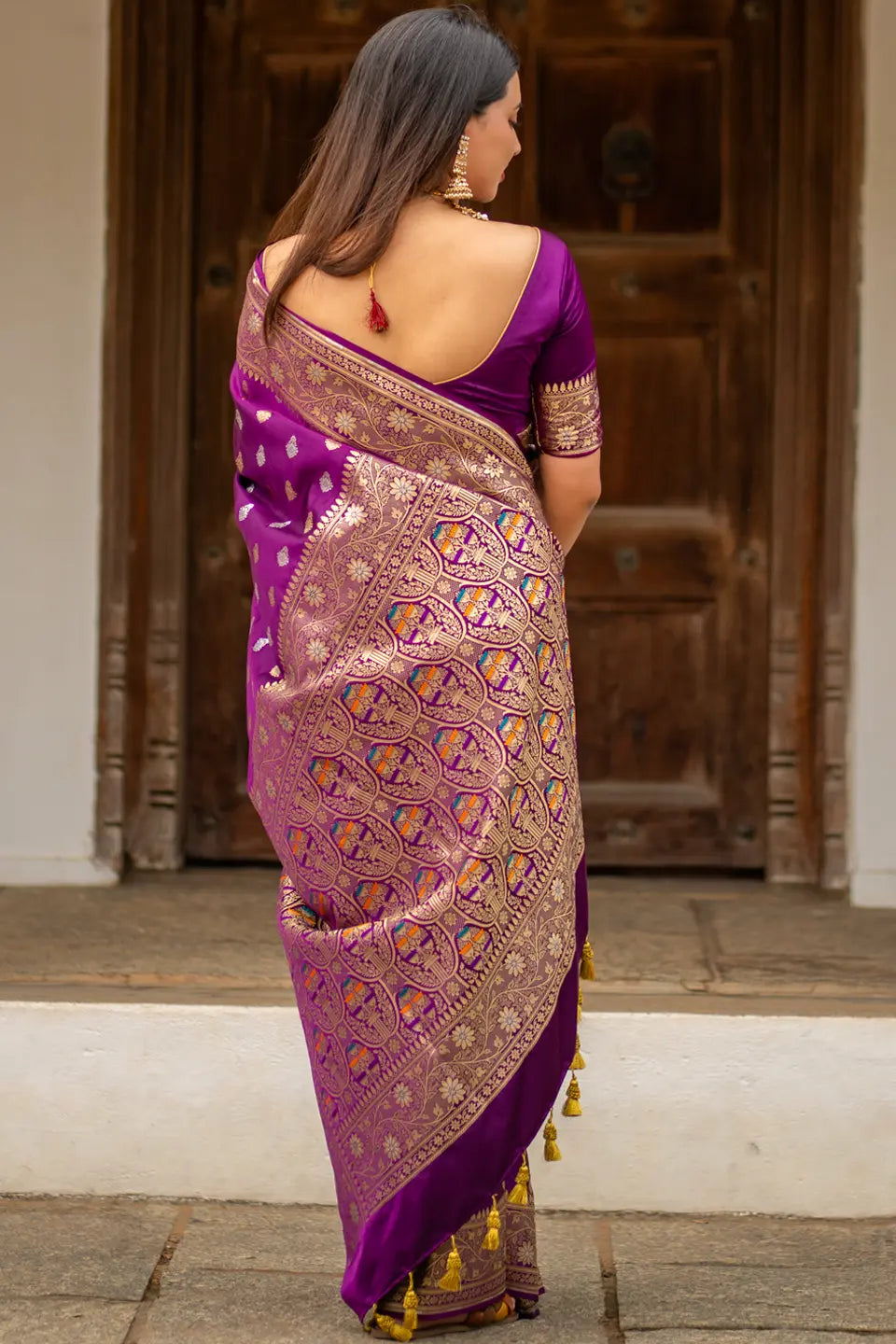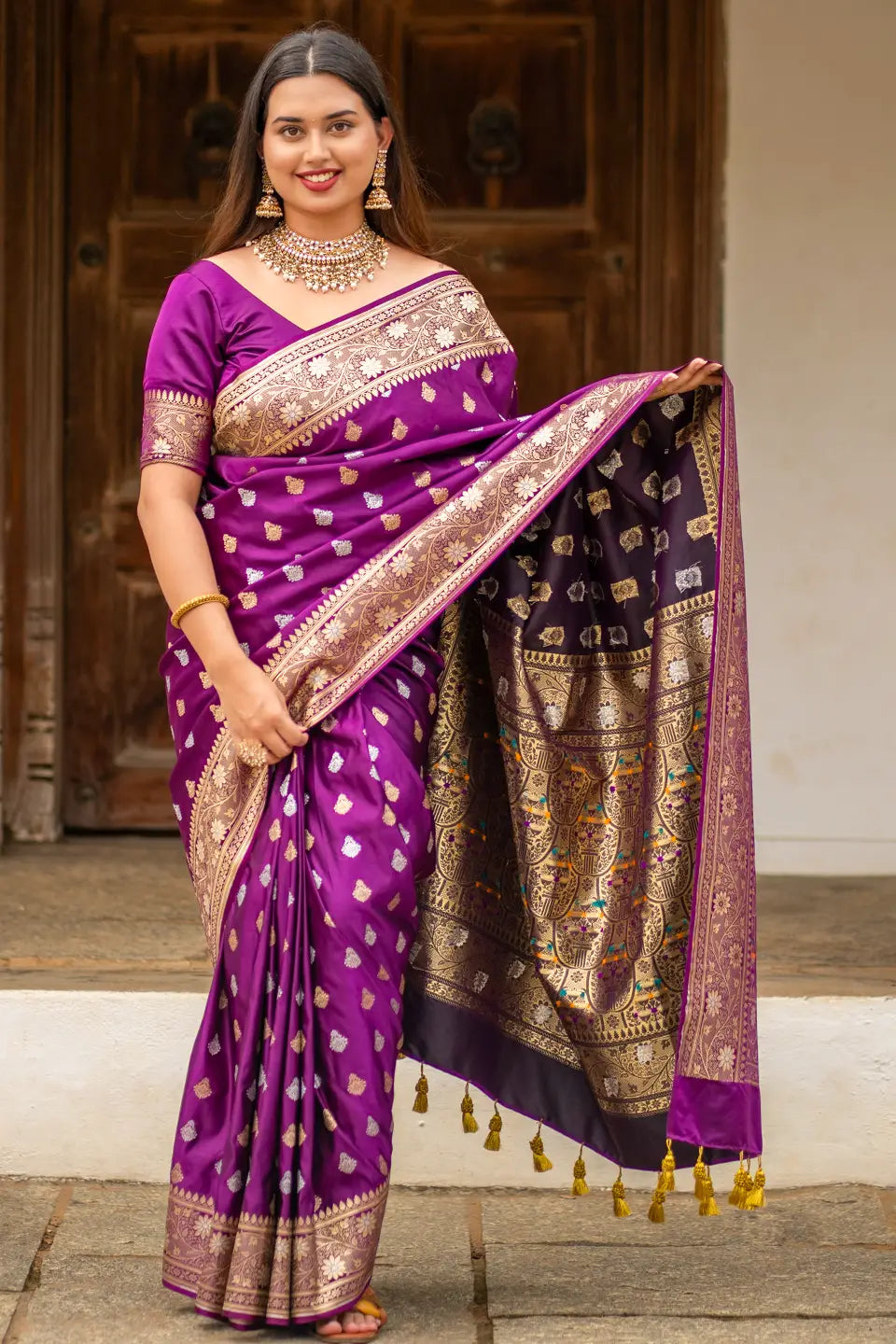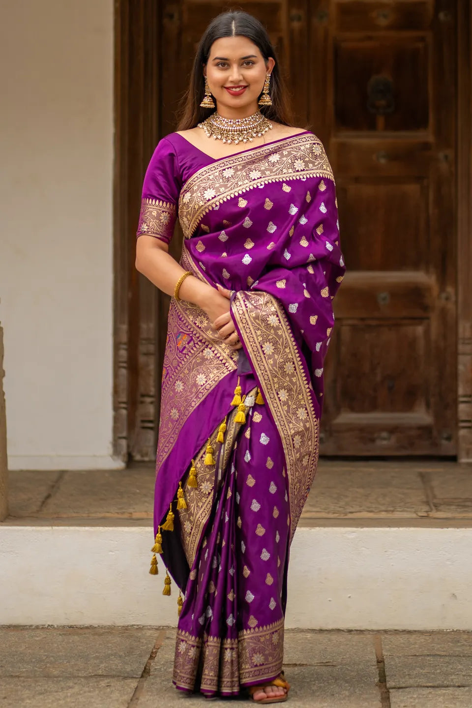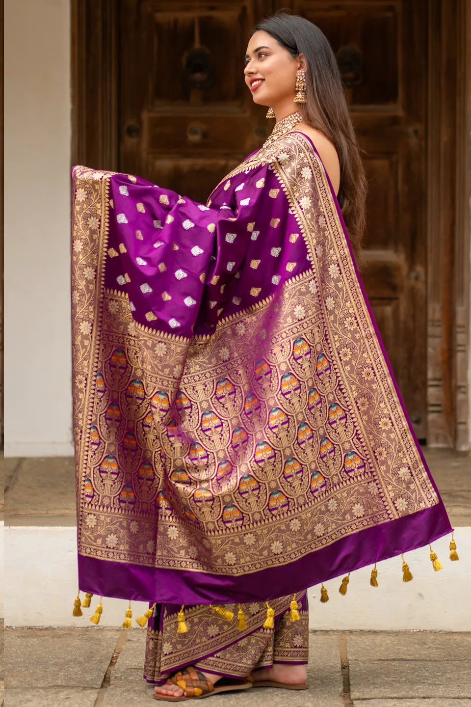 Do you fancy sarees? If luxury is your style, then this purple Banarasi silk saree is calling your name. Handwoven with pure Banarasi silk straight from Varanasi, this stunning wedding banarasi silk saree boasts a royal fig purple hue adorned with exquisite golden zari floral designs on the Pallu and border. The elegant motif designs on the body of the saree adds a regal touch, perfect for your special occasions. Don't miss out on this taste of royalty—add it to your cart now and indulge in the elegance of Banarasi silk!