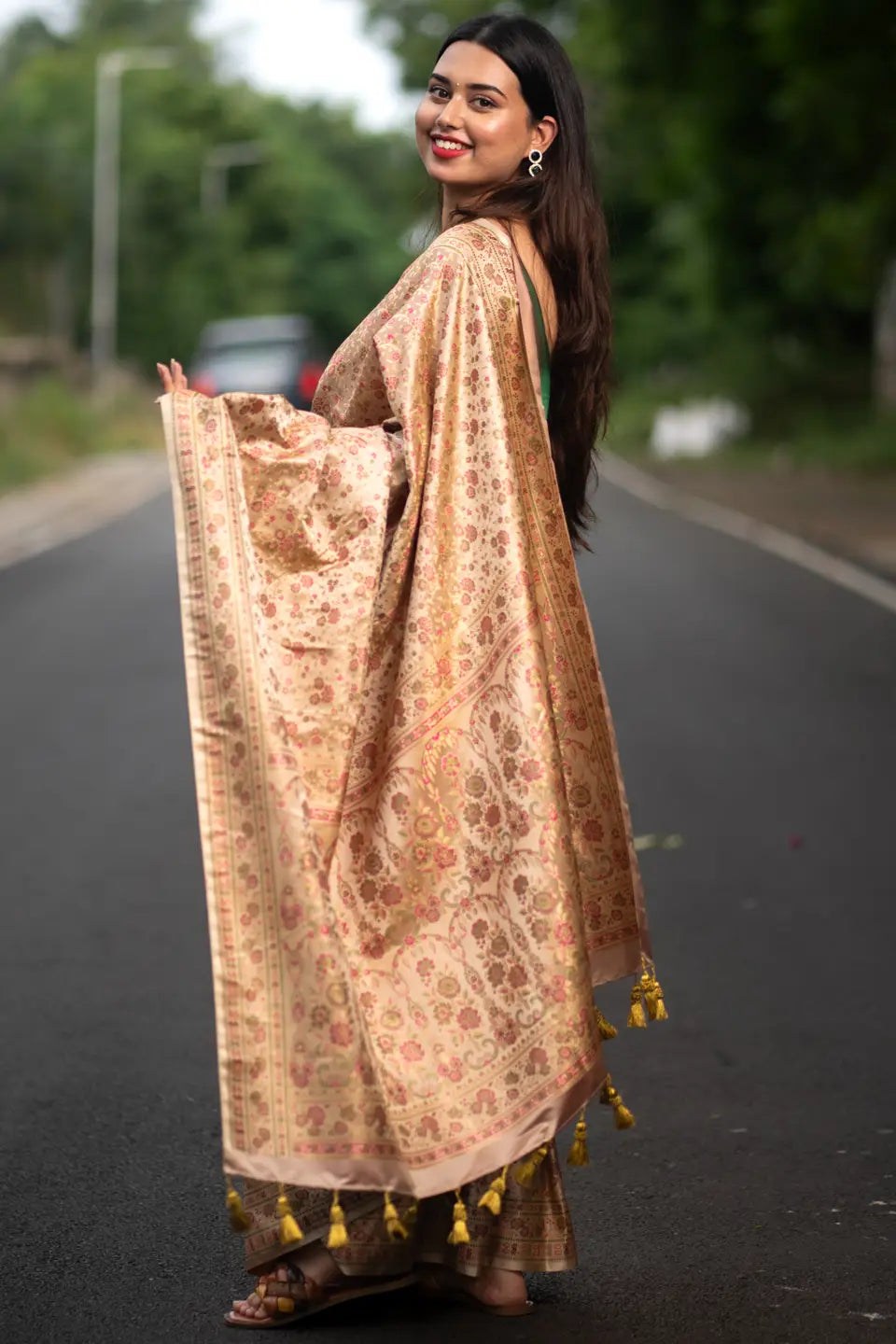 I bet you don't have a premium-quality Jamawar Silk Saree like this one! The intricate designs and patterns are inspired by the Mughal age, taking you back to those times. Woven with top-quality Banarasi brocade, this saree is carefully handcrafted for an authentic touch of Kashmiri style. This pine brown silk saree isn't just another piece; it's a true gem for all your wedding and festive occasions. Don't hesitate—grab this piece of royalty now!