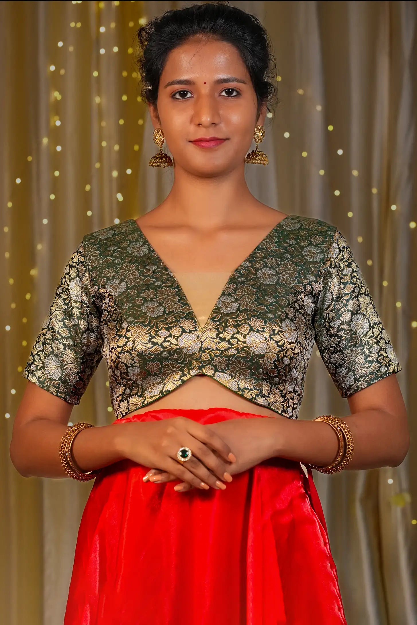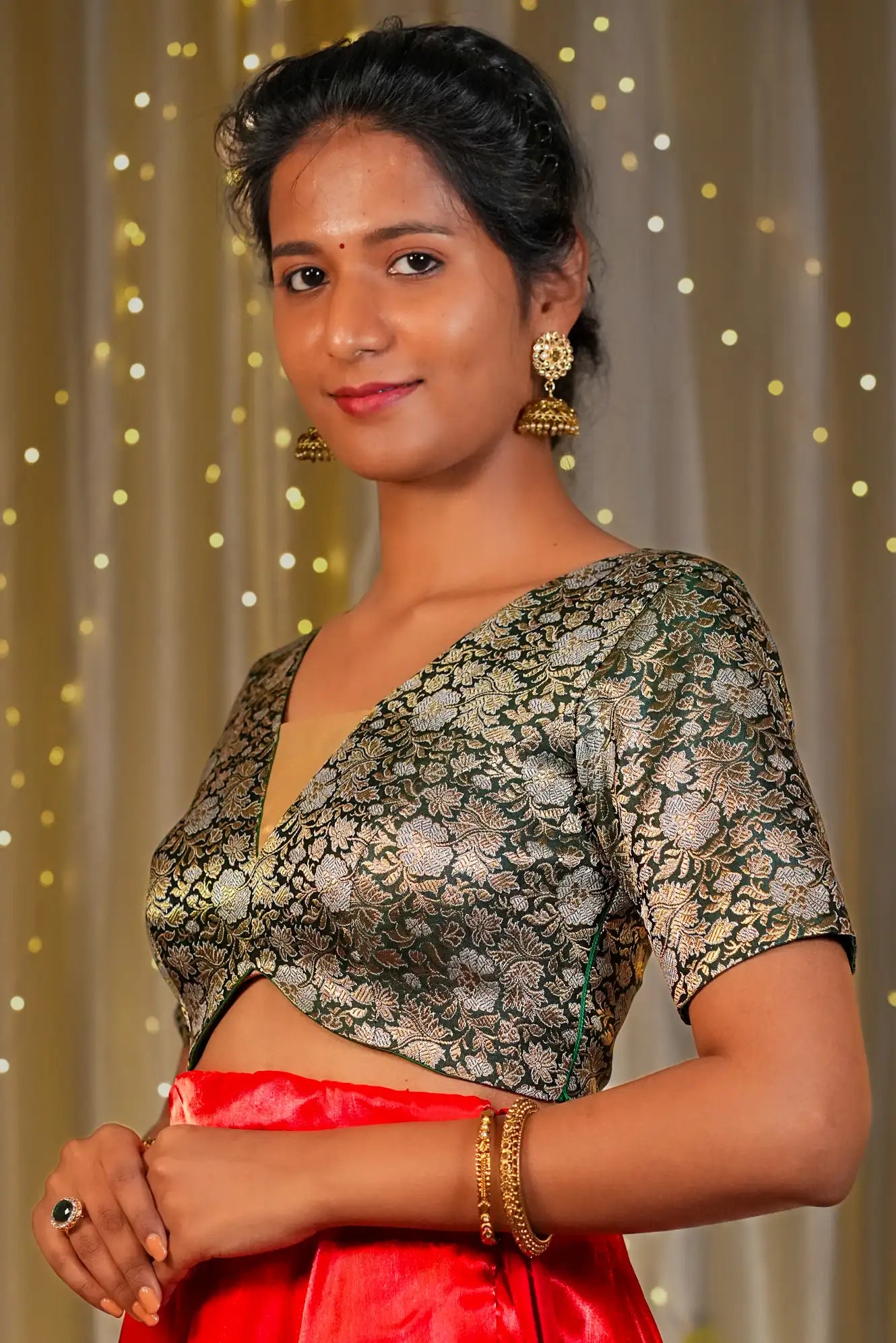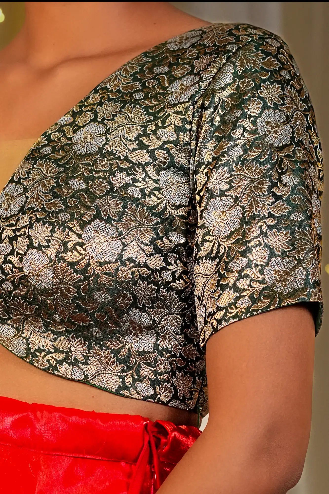 Step into elegance with this green deep V neck Banarasi blouse, complete with a flattering knot back and delicate rope design. The added side zipper enhances ease without compromising style. Ideal for mehendi or festive brunch looks.