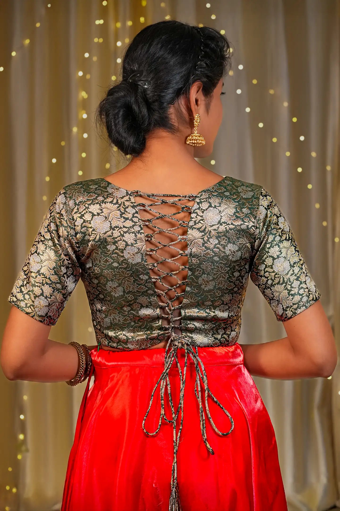 Style this green tie-up back knot blouse with a contrasting pink or mustard saree for a vibrant festive look. Add floral jewelry or meenakari earrings for a mehendi-ready vibe. A loose braid or side bun will showcase the blouse rope design beautifully.