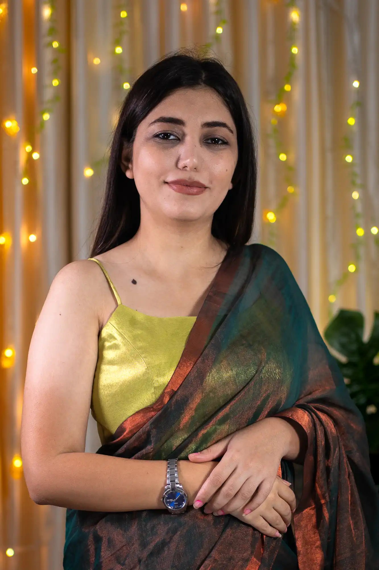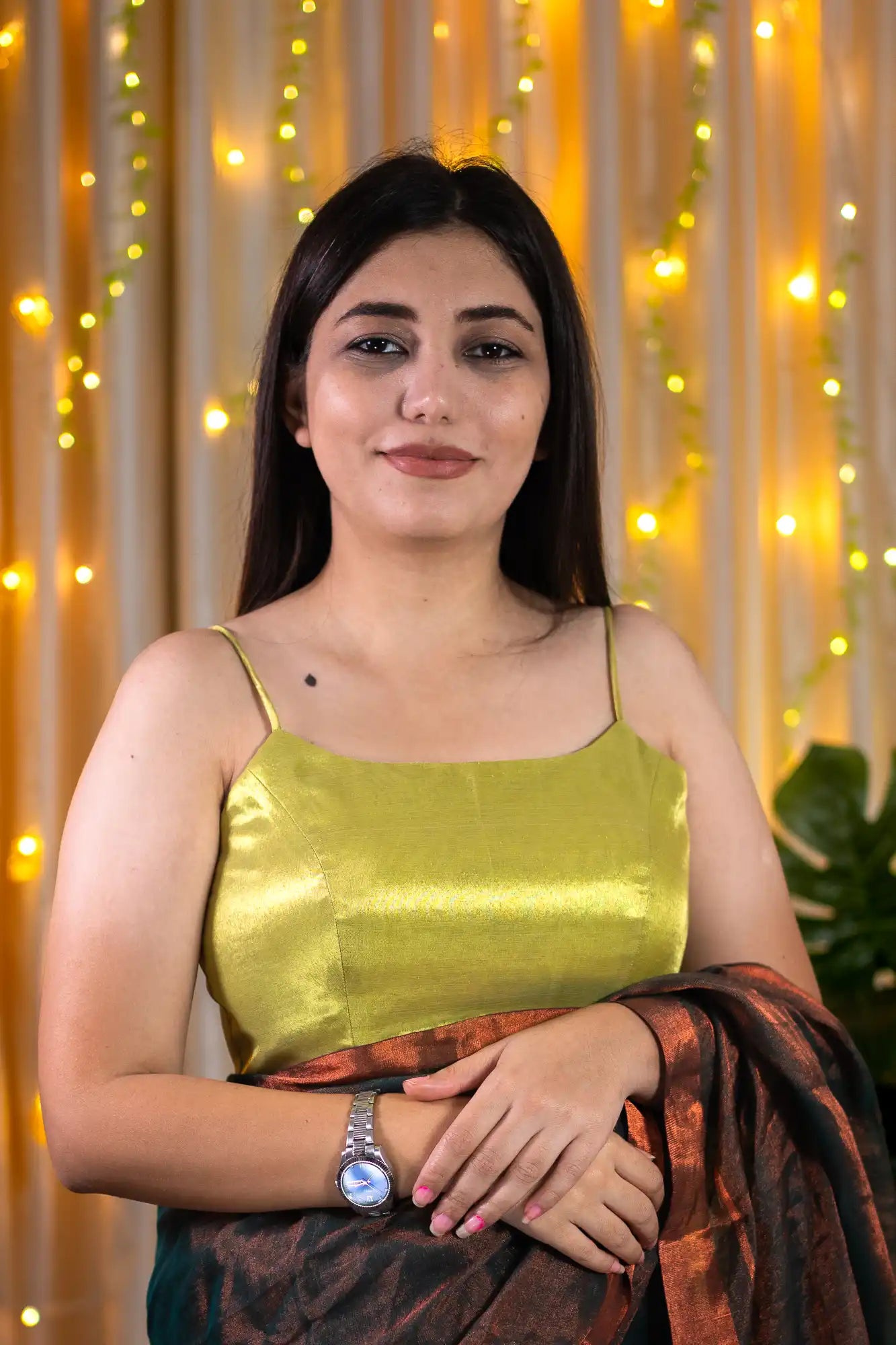 Don't miss out on the Spiral Gaze golden green Spaghetti Blouse - the perfect complement to your party outfits! This exquisite blouse, made from luxurious tissue silk fabric, features a glistening golden green surface that will make you shine at any vibrant event. Meticulously crafted for comfort and to flatter your curves in all the right places, this readymade crop top blouse is perfect for both traditional occasions and parties. Enhance your blouse collection with this ethnic beauty. Hurry, and seize the opportunity!