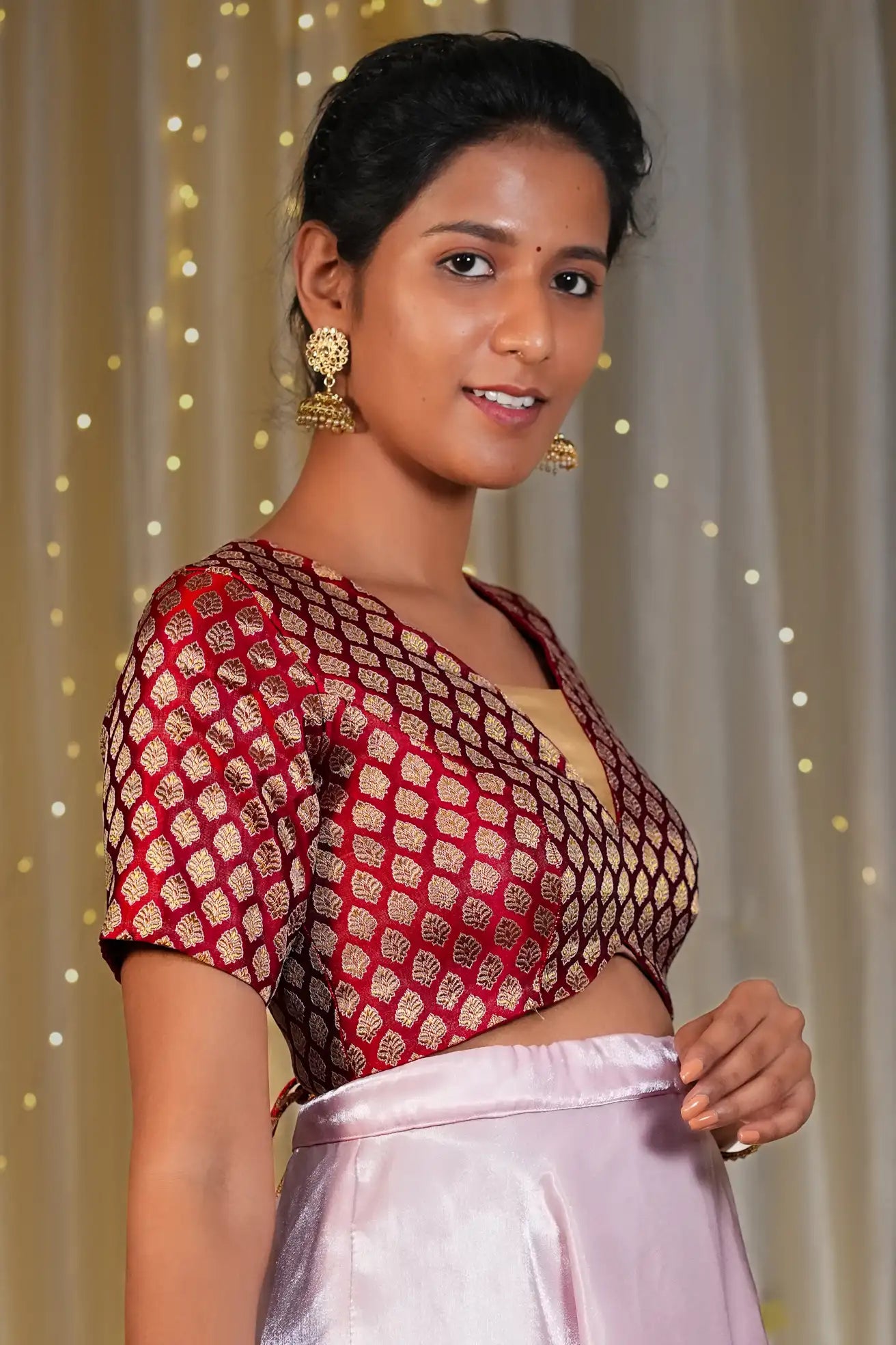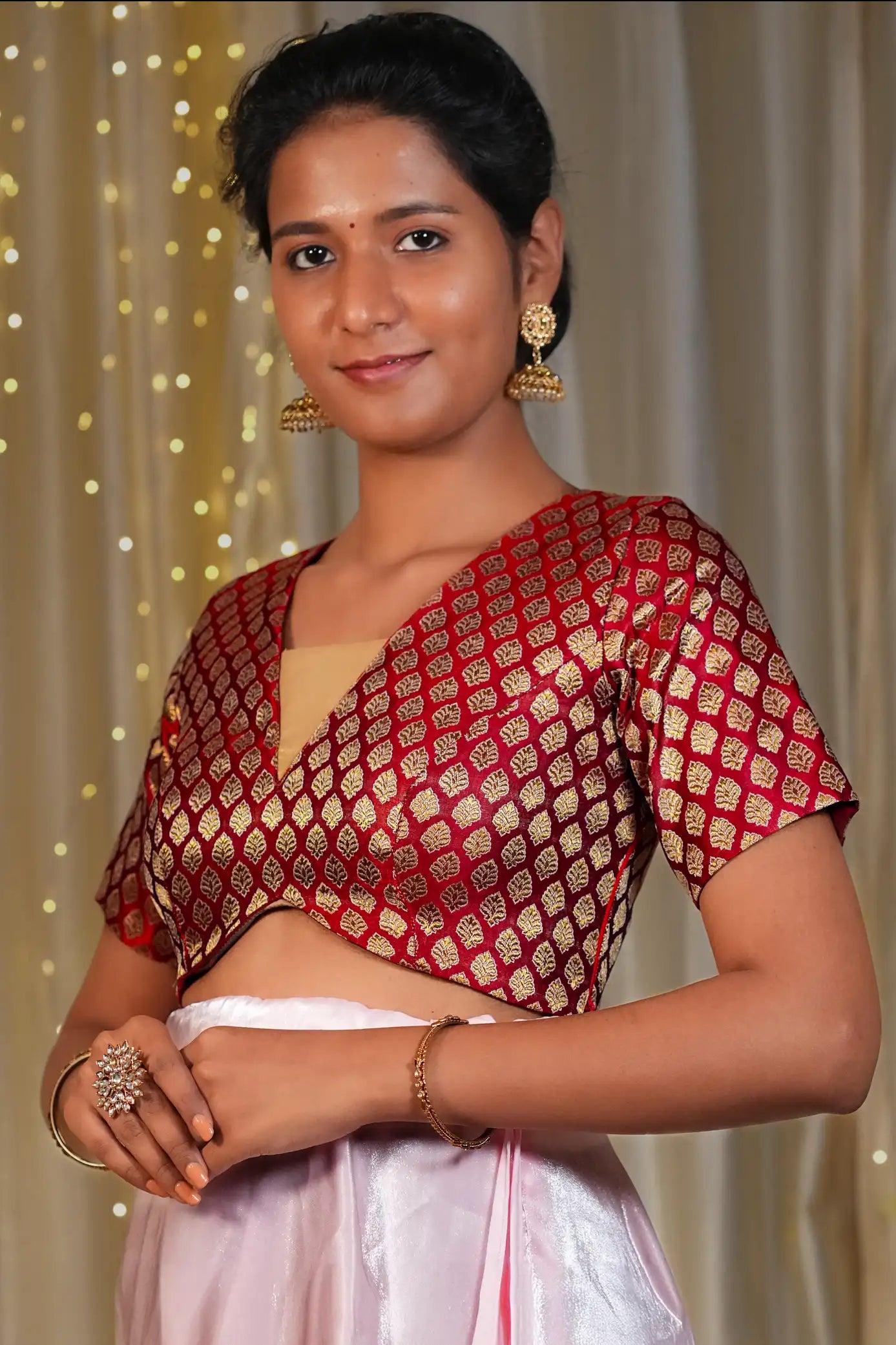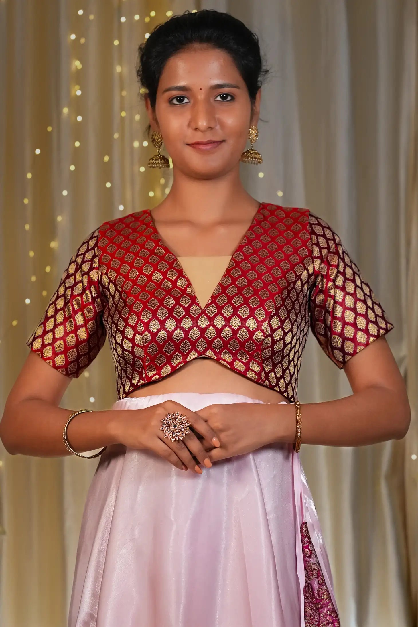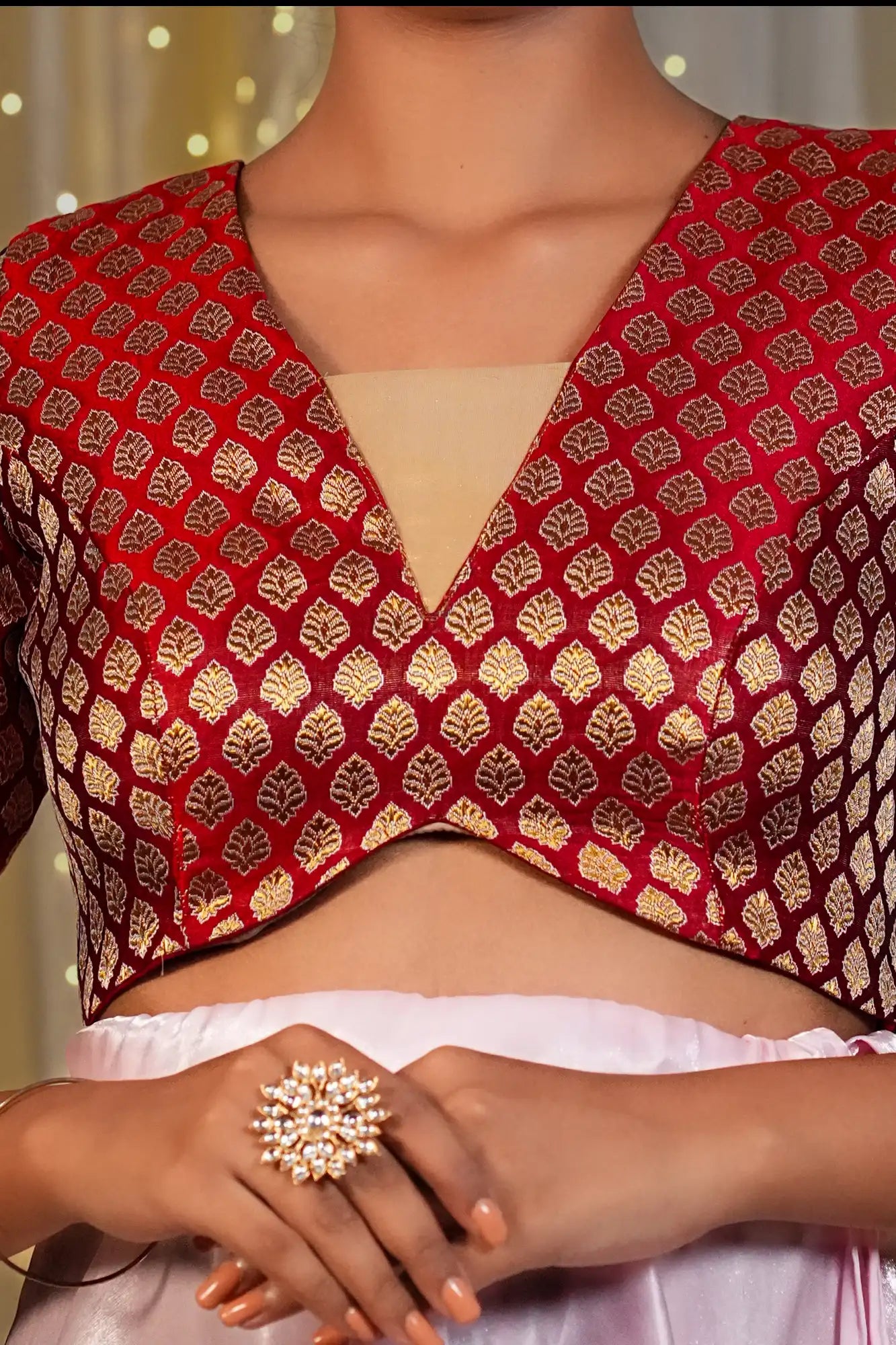 Make a bold style statement with this red back tie-up blouse crafted from luxurious Banarasi fabric. Designed with a striking deep V neck blouse design for women and a sleek knot blouse rope design at the back, it radiates elegance and edge. The hidden side zipper offers a secure fit without compromising comfort. A standout banarasi red blouse design for sangeet nights and bridal glam.