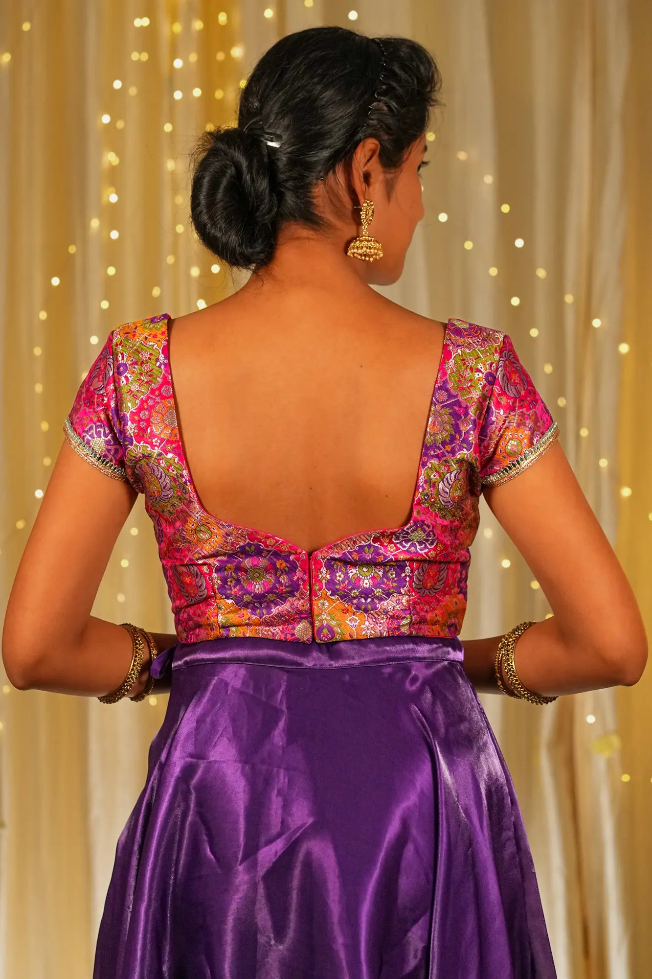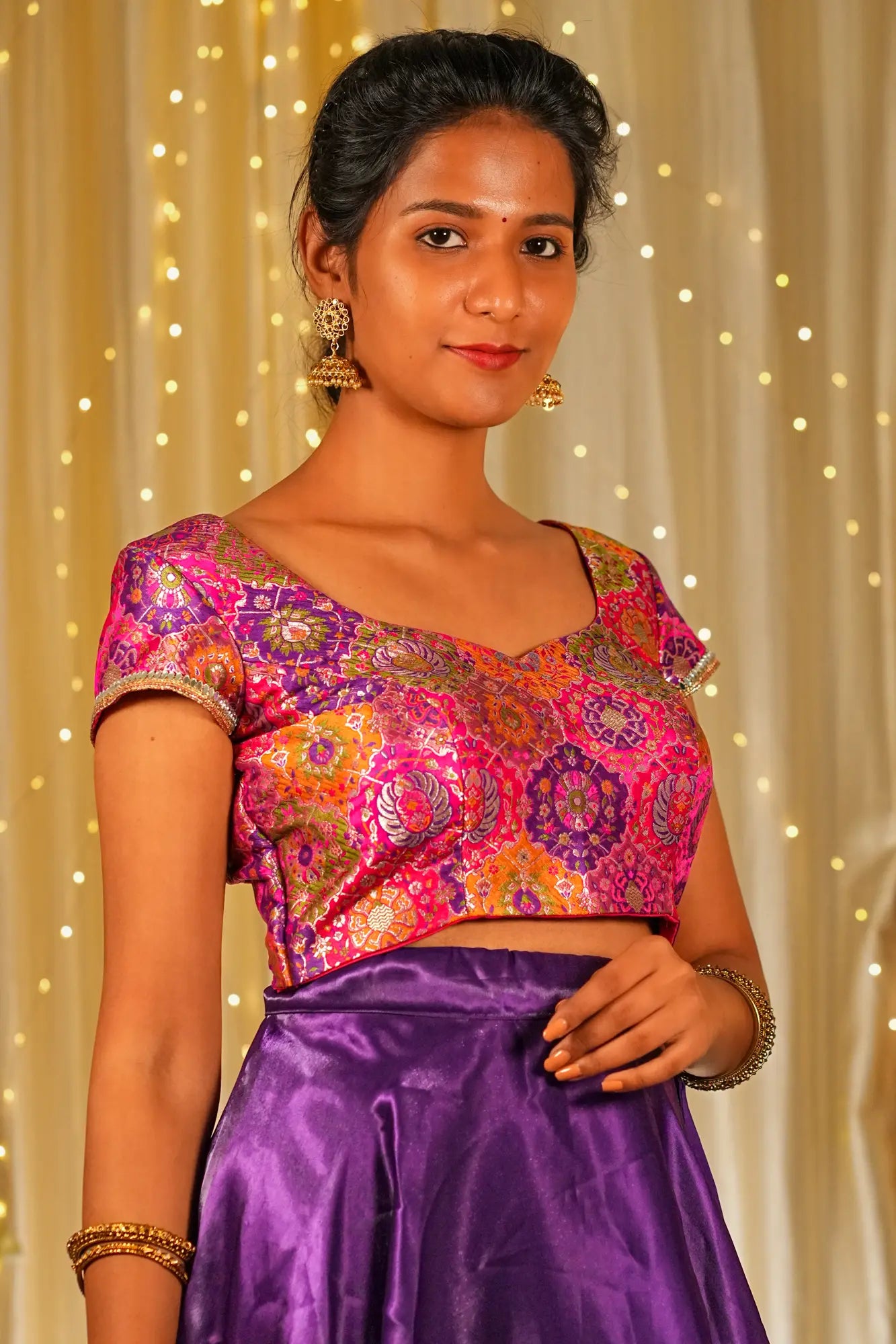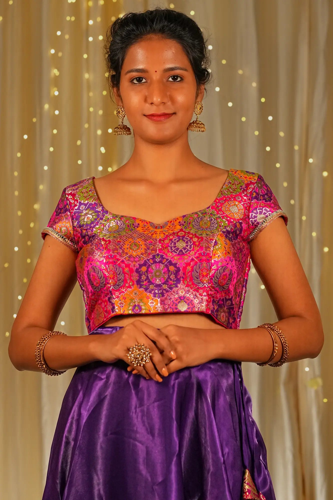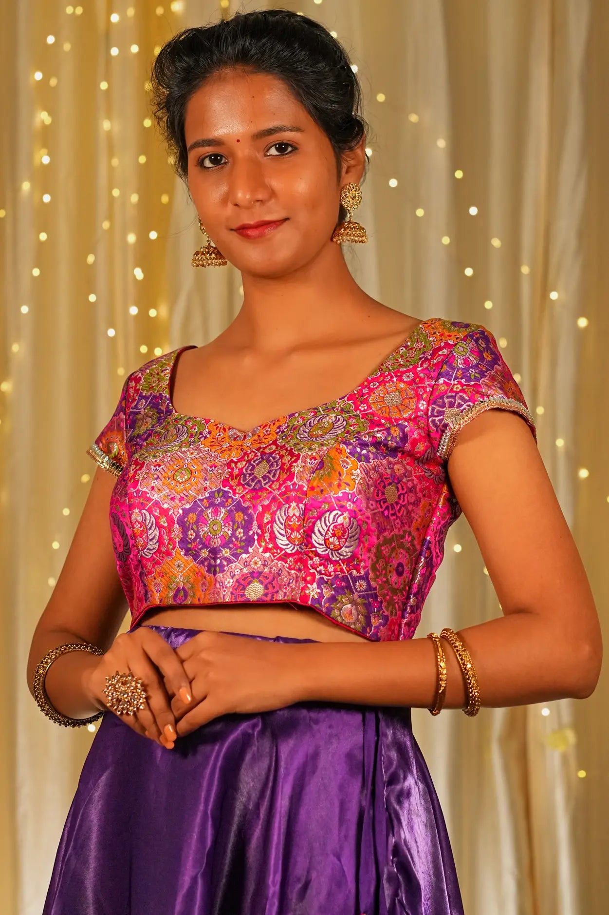 Pair this pink Banarasi blouse with a vibrant gold, violet, or cream saree for a regal festive look. Enhance its elegance with gold or polki jewelry and a matching clutch. Style your hair in a neat bun with fresh flowers or soft waves for a graceful finish. Complete your look with kohl-lined eyes and a rosy lip for a radiant glow!