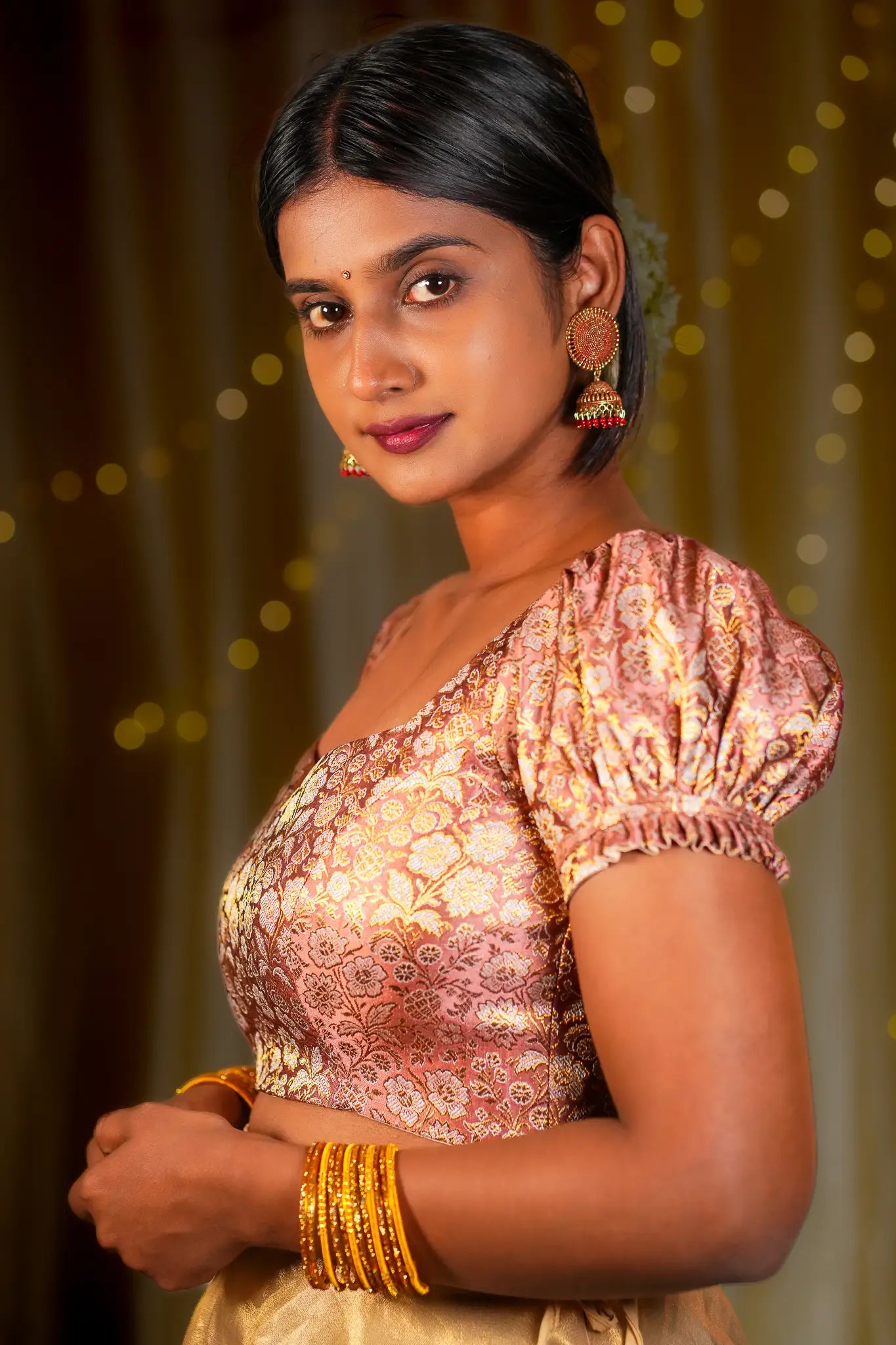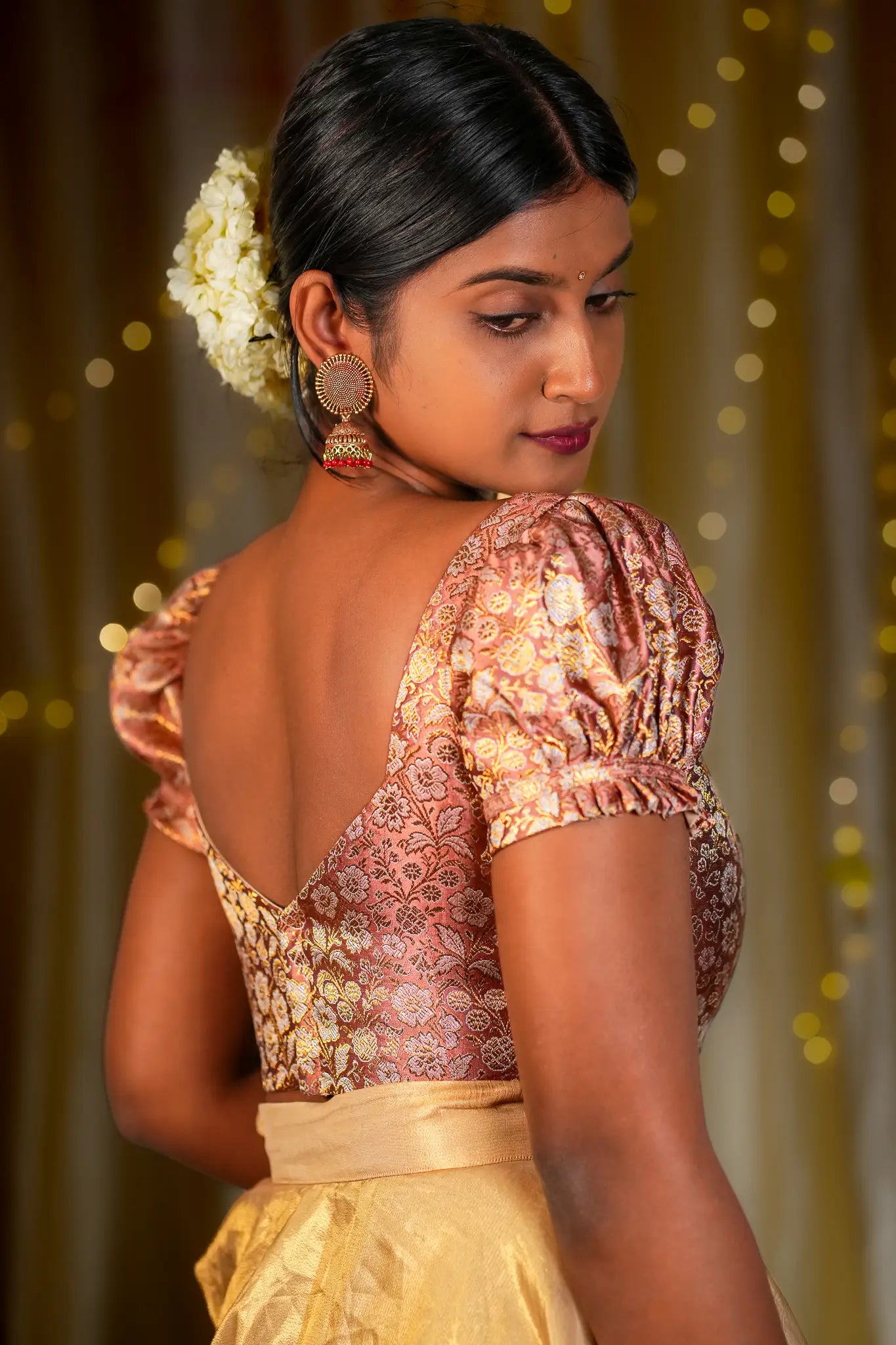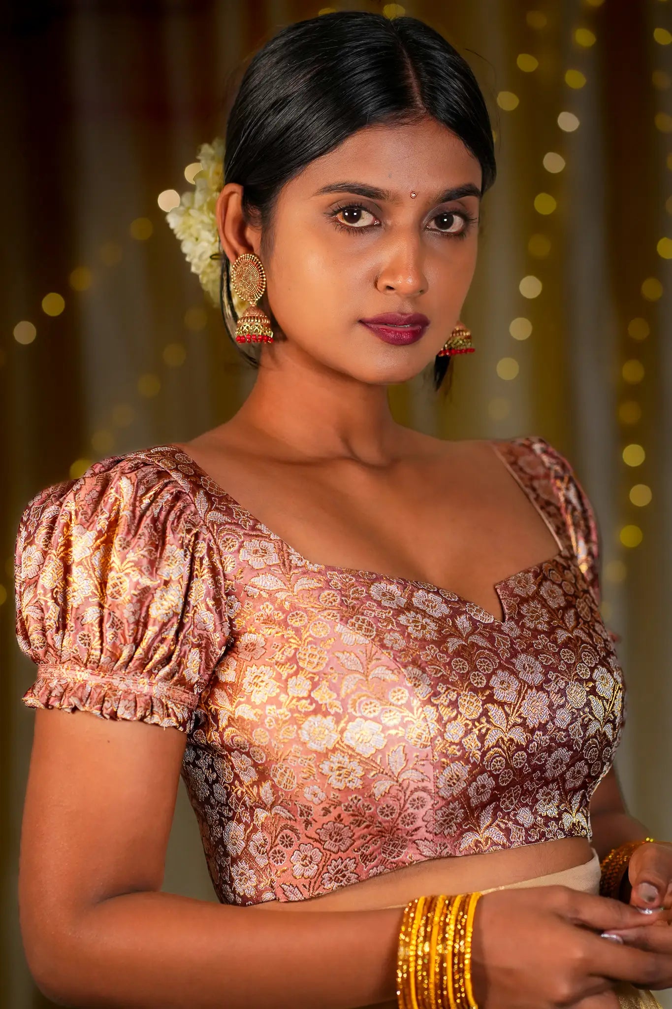 Pair this beige Banarasi blouse with vibrant or jewel-toned sarees to create a striking contrast. The square neckline is perfect for showcasing a statement necklace or layered pearls. Style your hair in a soft bun or side-swept waves to enhance the blouse’s elegant puff sleeves. Finish the look with subtle makeup and gold accents for a graceful, timeless appearance.