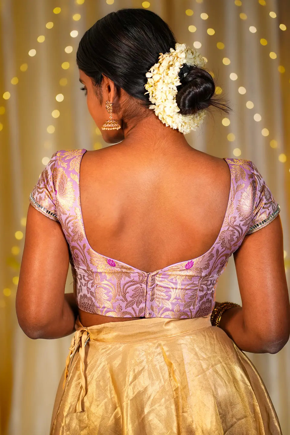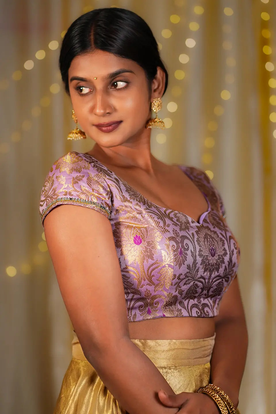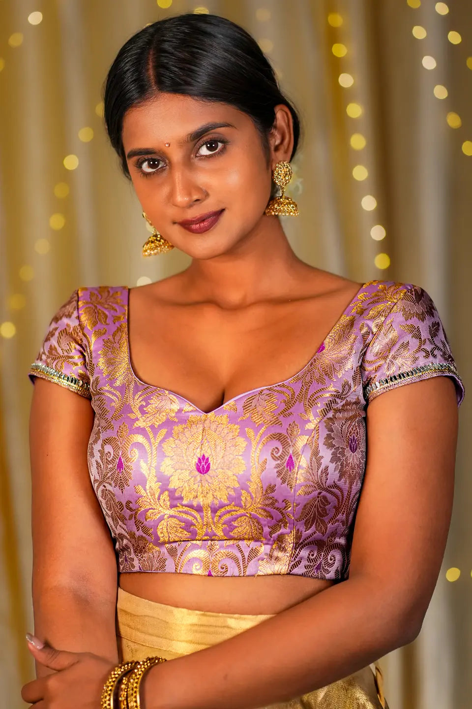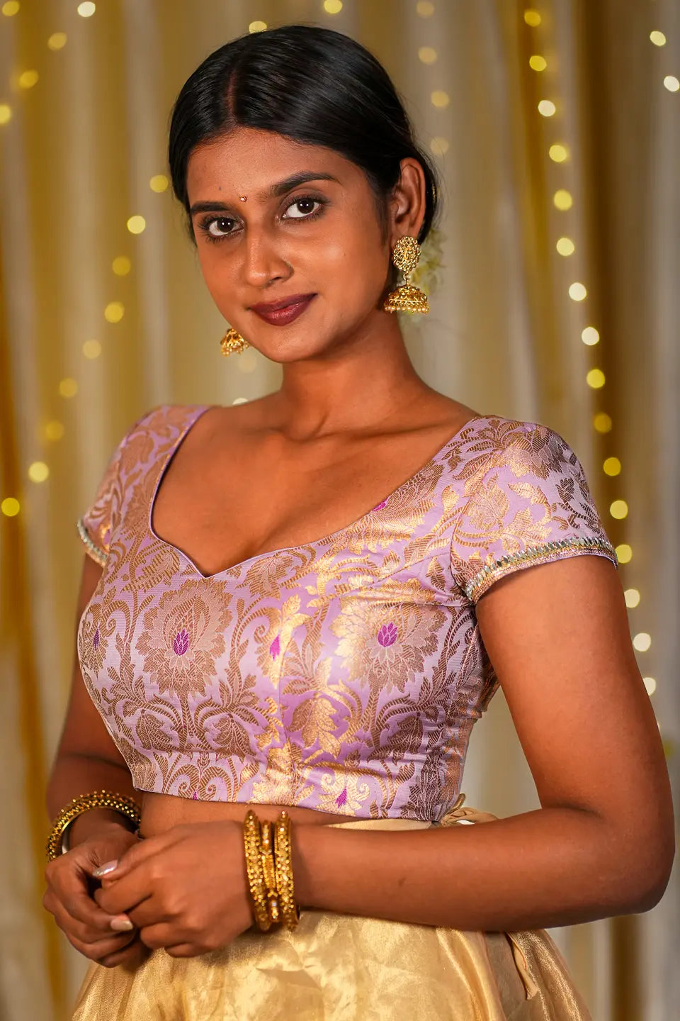 💜 Your saree deserves this! Say hello to our stunning lavender Banarasi blouse, designed with premium fabric, golden and rose-gold motifs, and a gorgeous sweetheart neckline for a feminine, elegant look. The cap sleeves, complete with mirror detailing, make this blouse a true standout. Whether you’re heading to a wedding or a festive event, this is the piece your wardrobe has been missing. Don’t wait—add it to your cart and let us deliver style perfection to your doorstep! ✨